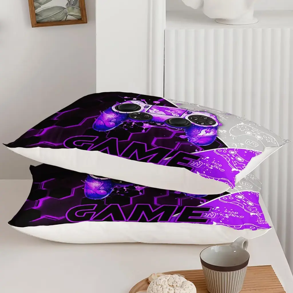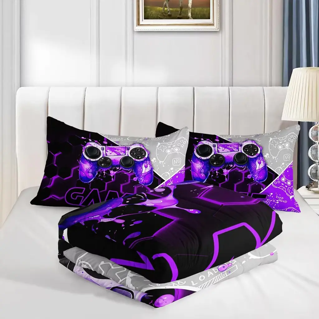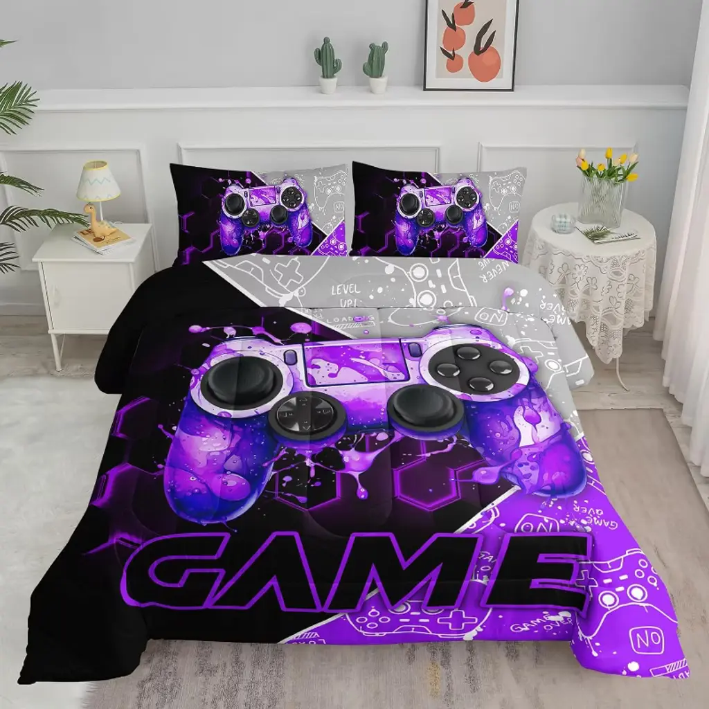 This boy-exclusive 3D gaming controller geometric bedding three-piece set features a modern purple graffiti style as its design core, seamlessly blending the dynamic energy of gaming with the unique personality of art. The three-dimensional, lifelike 3D game controller patterns seem to leap off the bedding, instantly igniting a boy's passion for gaming. The interplay of geometric lines and purple graffiti not only showcases a trendy, individualistic style but also conveys vibrant youthful energy, transforming the bedroom into a cool, gaming hub.The fabric is made from skin-friendly, breathable materials, offering a soft and comfortable touch, ensuring boys can sleep soundly in a comfortable environment. Whether decorating a children's room or fulfilling teenagers' pursuit of a personalized sleeping space, this bedding set stands out as a stylish focal point in the bedroom, adding a touch of trendy flair to boys' lives.