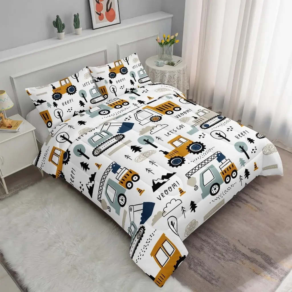 This cartoon car-themed children's three-piece bedding set is specially designed for boys' and girls' bedrooms, brimming with childlike charm and vitality, and suitable for all seasons. The bedding is adorned with a variety of cartoon car patterns, including playful sedans, majestic trucks, and adorable buses. The vibrant colors and lifelike designs create a mini car paradise that instantly captures children's attention and sparks their curiosity and desire to explore the world. The fabric is made from skin-friendly, breathable, and warm materials, ensuring a comfortable sleeping experience for children year-round. The overall style is lively yet versatile, seamlessly blending into the dynamic atmosphere of a boy's bedroom while also complementing the cute and charming style of a girl's bedroom. Let children drift off to sleep in a world filled with cartoon cars, enjoying sweet and restful moments every day.