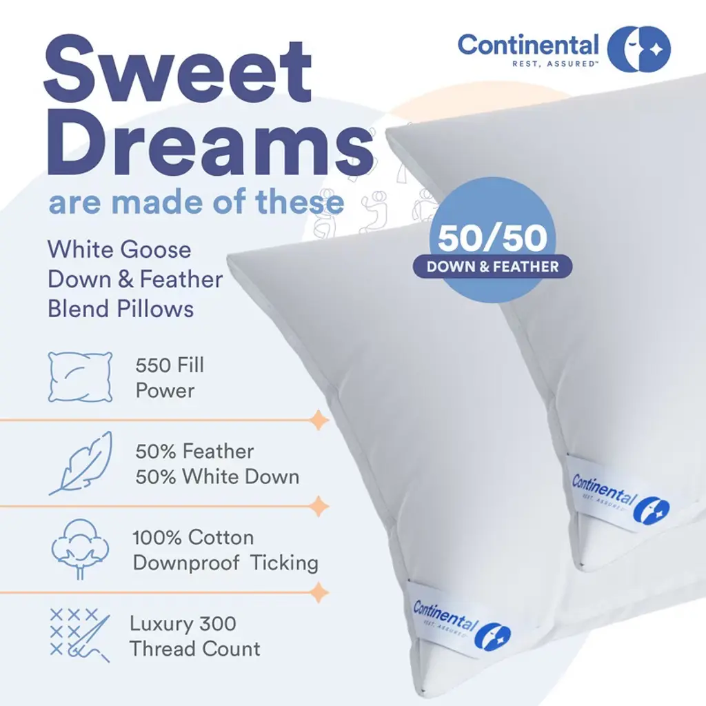 Continental Bedding Down & Feather Pillows For Bed- 2 Pack – Soft Support With 100% Cotton Cover - Super Standard Size