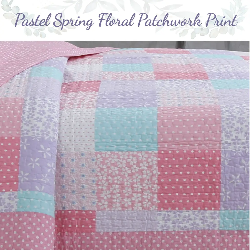 The soft look on this simplistic patchwork style quilt set features sweet colors and blooming flowers. This quilt is decorated with baby pink, baby blue, and baby purple all around the quilt. Pretty and attractive, this bed set will certainly enhance the entire look of your bedroom interior. This quilt set can be machine-washed and tumble-dried to refresh its look, and wash any dirt and grime. It is pre-shrunk, and will retain its shape even after a wash.Features: Twin dimensions:Queen dimensions:The digital images we display have the most accurate color possible. However, due to differences in computer monitors, we cannot be responsible for variations in color between the actual product and your screen.