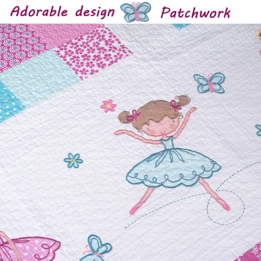 Dance your way into the perfect bedroom with this quilt Set. This fun collection features ballerinas dancing across the center of the coverlet in shades of purple and pink. The sham features a cozy and fun way to complete this set. This quilt set can be machine-washed and tumble-dried to refresh its look, and wash any dirt and grime. It is pre-shrunk, and will retain its shape even after a wash. Set includes decor pillows.Features:Twin dimensions:Queen dimensions:Decor Throw Pillows: