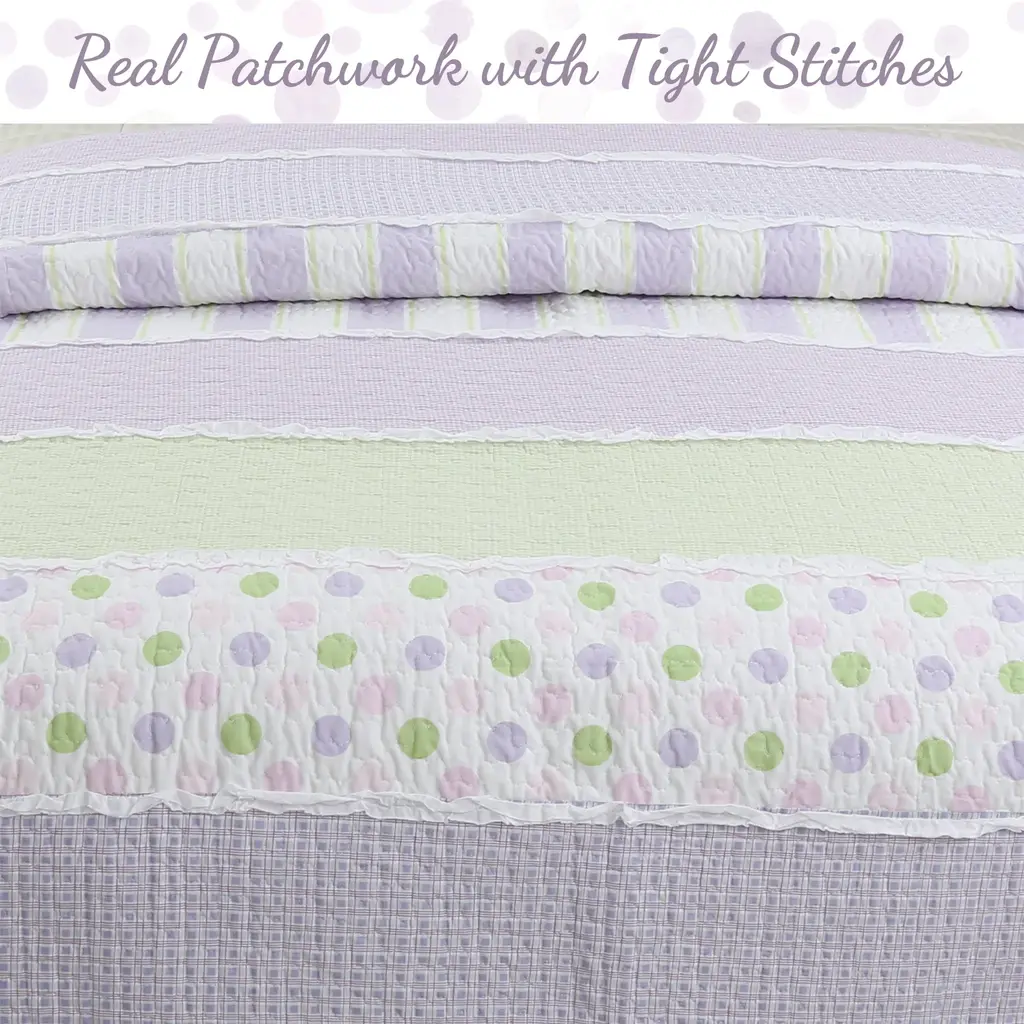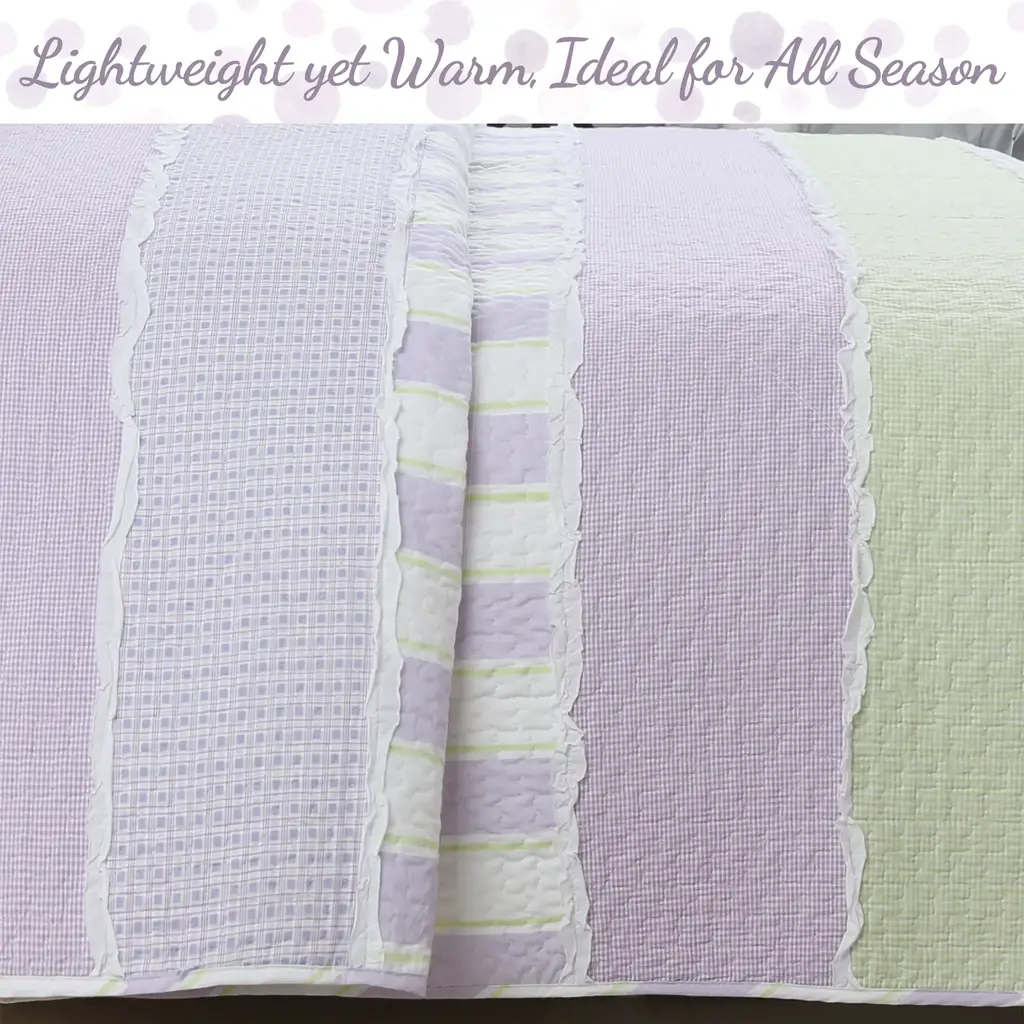 Cozy Line Lilac Purple Green Stripe Polka Dot Checker White Ruffle Patchwork Cotton Reversible Quilt Bedding Set - Queen