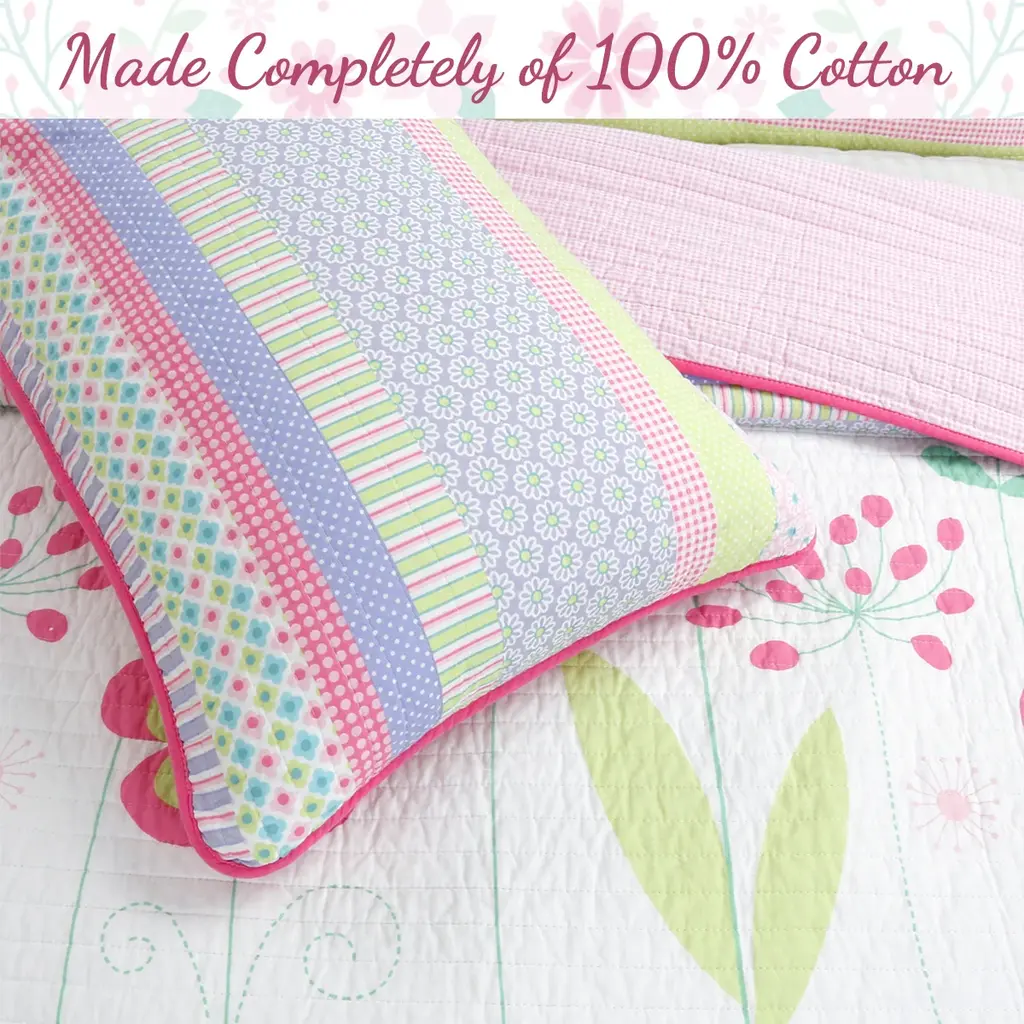 Brighten up your sleeping space with this cute purple, pink and green whimsical floral garden cotton quilt set. Pattern so fun it reminds you of childhood memories playing in the outdoor garden. With wonderful sprouts of colors of purple, pink and green. Fun little flowers and polka dots stripped across the quilt with cutest spring flower garden adds the perfect finishing touch to this quilt. This quilt set is crafted of 100% Cotton. Quilt is reversible so that you can quickly and easily change the look of your room. Set offered in Twin and Queen (with & without decor throw pillows). Coordinating accessories also available for purchase separately Décor Throw Pillows. With its easy-care machine-washable cotton material, this quilt set is easy and quick to launder. Spot clean pillows. Quilt Sets (without decor throw pillow):Quilt Sets (with decor throw pillow):Features:Twin Dimensions:Queen Dimensions:Decor Throw PIllow Dimensions:The digital images we display have the most accurate color possible. However, due to differences in computer monitors, we cannot be responsible for variations in color between the actual product and your screen.