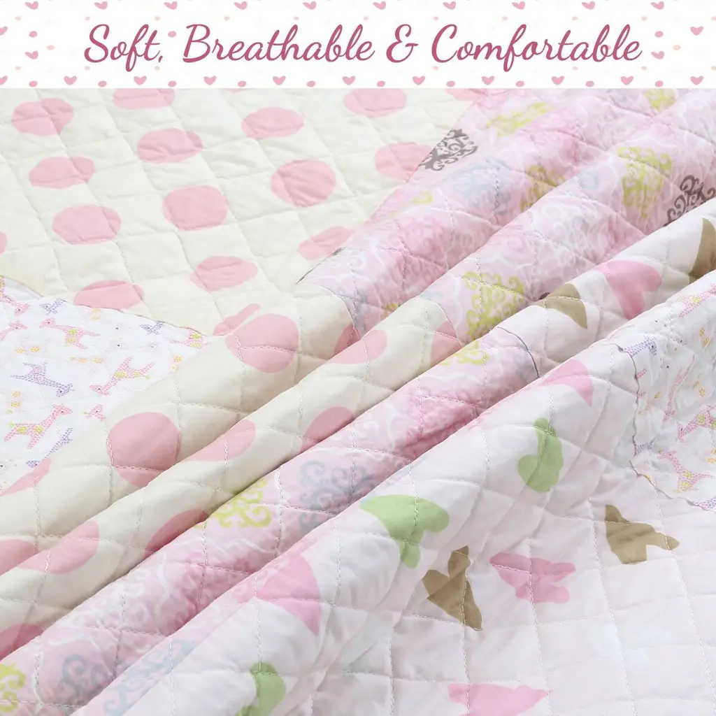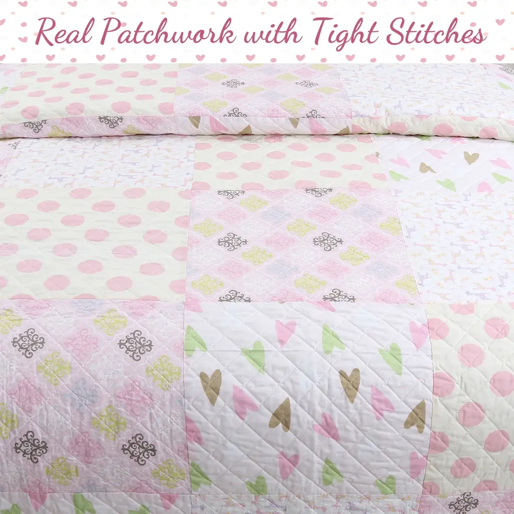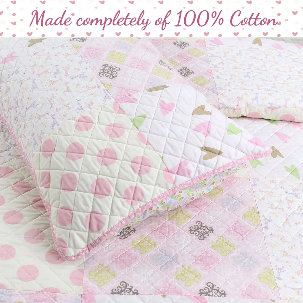 Cozy Line Pink Heart Floral Dot Giraffe Medallion Cotton Patchwork Reversible Quilt Bedding Set - Twin