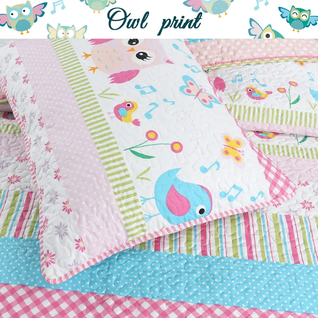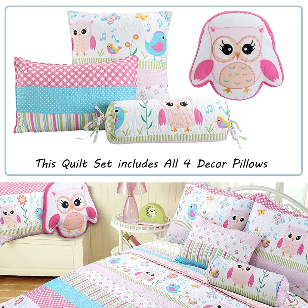 Cozy Line Spring Time Birds Owl Floral Pink Quilt Bedding Set With Throw Pillows - Twin