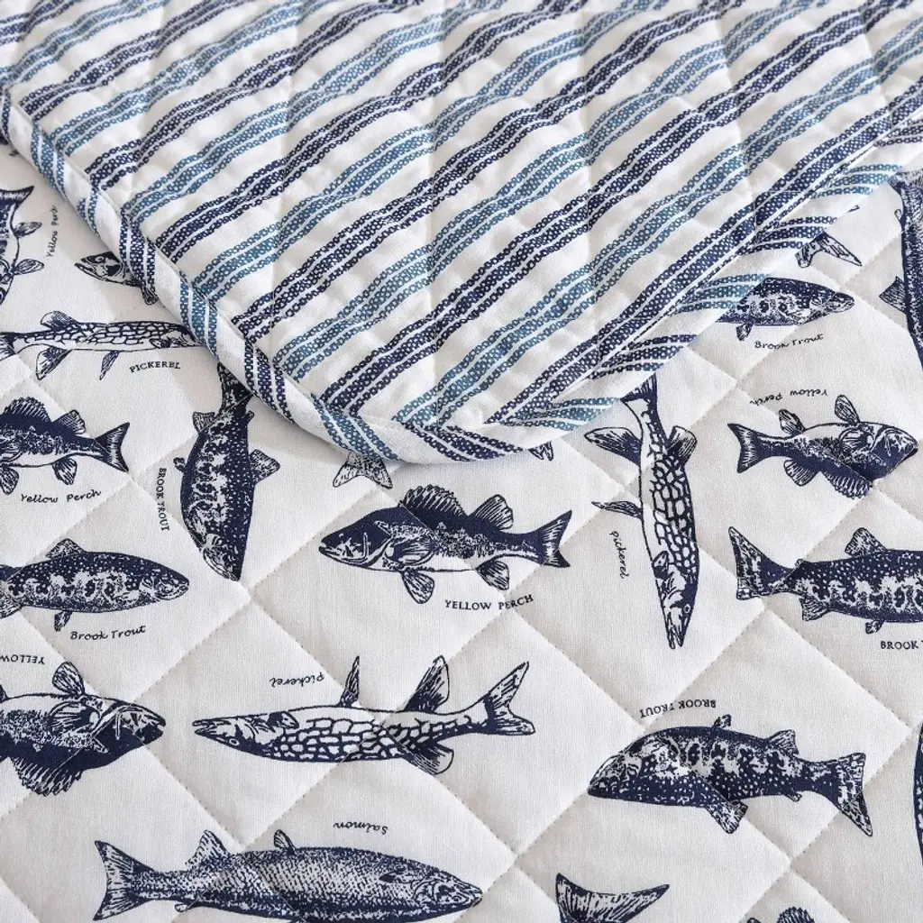 Transform your bedroom with the Eddie Bauer Wes Fish quilt sham set, featuring intricately detailed sketches of various fish species in a classic navy tone on a neutral ground. The illustrations capture the charm and beauty of aquatic life, offering a refined yet playful design. The quilt reverses to a coordinating striped pattern, offering versatility and style with two distinct looks in one. This design adds a sophisticated aesthetic, making it perfect for refreshing your space with both comfort and character. Crafted from 100% cotton, the quilt is soft, smooth, and breathable, with a subtle texture that enhances comfort. The plain weaving construction ensures a balanced, even surface that is perfect for year-round use. Filled with a blend of 80% cotton and 20% polyester, it offers a lightweight yet warm feel, making it ideal for both warmer and cooler months. The set includes shams to complete the look (one sham included with the twin size). The quilt features rounded corners and a unique diamond quilt stitch details that reflect Eddie Bauer's commitment to quality and craftsmanship. Thoughtfully packaged without plastic for sustainability, this quilt set is machine washable for easy care, ensuring long-lasting comfort and style. Available in a variety of sizes, including twin, queen, and king, the West Fish quilt sham set is the perfect way to refresh your bedroom with elegance, comfort, and timeless design.