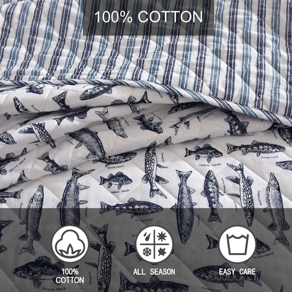 Eddie Bauer 3Pc Full/queen Wes Fish Quilt Bedding Set Blue