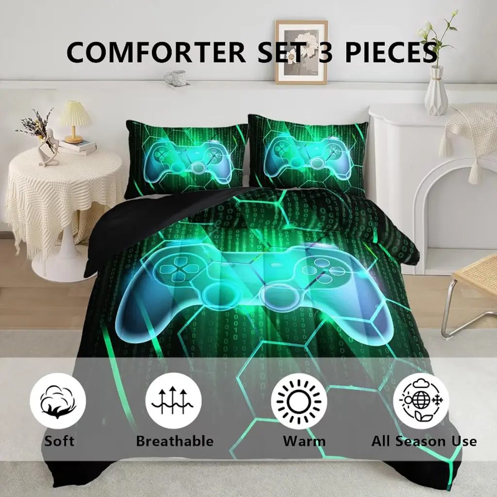 This gaming controller-themed three-piece bedding set is specially designed for boys, teenagers, men, and adults who love gaming. Featuring a green and black color scheme with geometric hexagonal patterns, it seamlessly blends the dynamic energy of the gaming world with a futuristic, tech-inspired aesthetic. The vibrant green evokes the lively elements of gaming scenes, while the sleek black adds a cool, sophisticated touch. The geometric hexagonal patterns are arranged in an orderly yet understated manner, effortlessly creating a bedroom space immersed in a gaming-inspired atmosphere. The fabric is soft and breathable, providing a comfortable sleeping experience. After an exhilarating gaming session, players can drift off to sleep in the familiar gaming atmosphere.Whether decorating a teenager's room or adding personality to an adult gamer's bedroom, this set is a stylish yet practical choice.