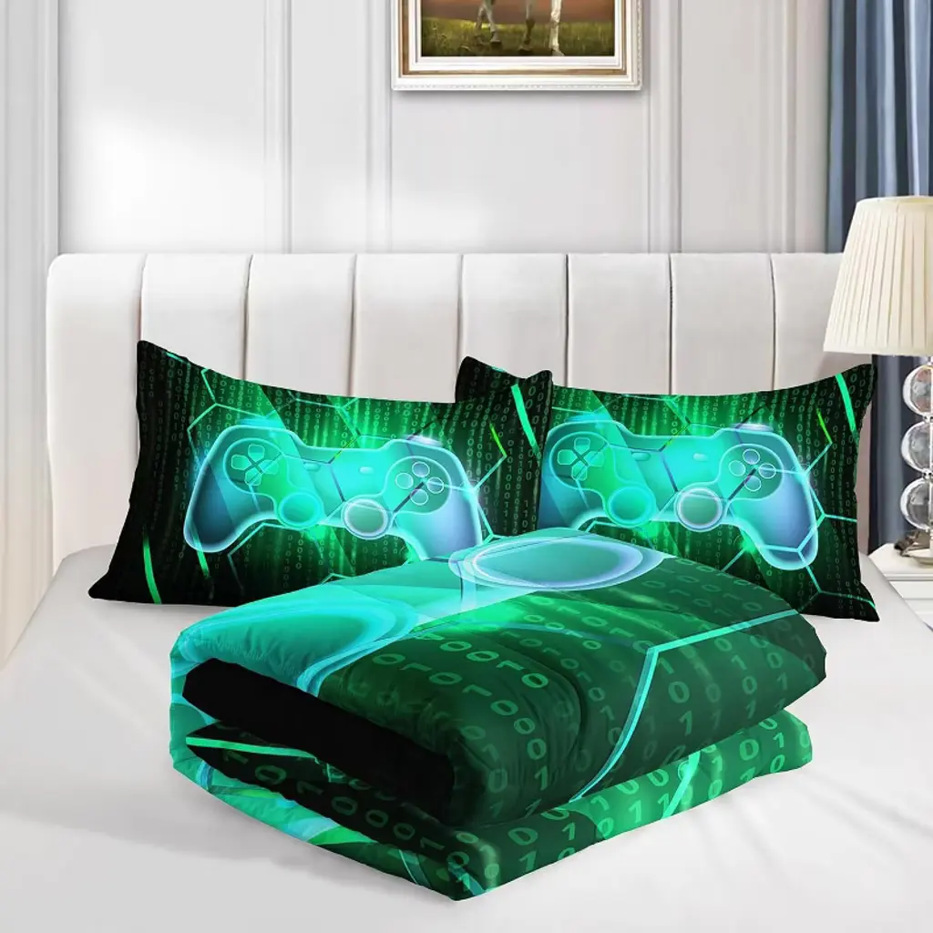 Game Controller Bedding Set, Boys' Games, Geometric Hexagon Pattern, Suitable For Teenagers, Men, And Adults, Three-piece Set, Green And Black,full