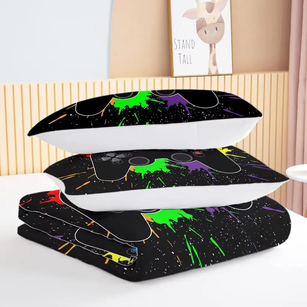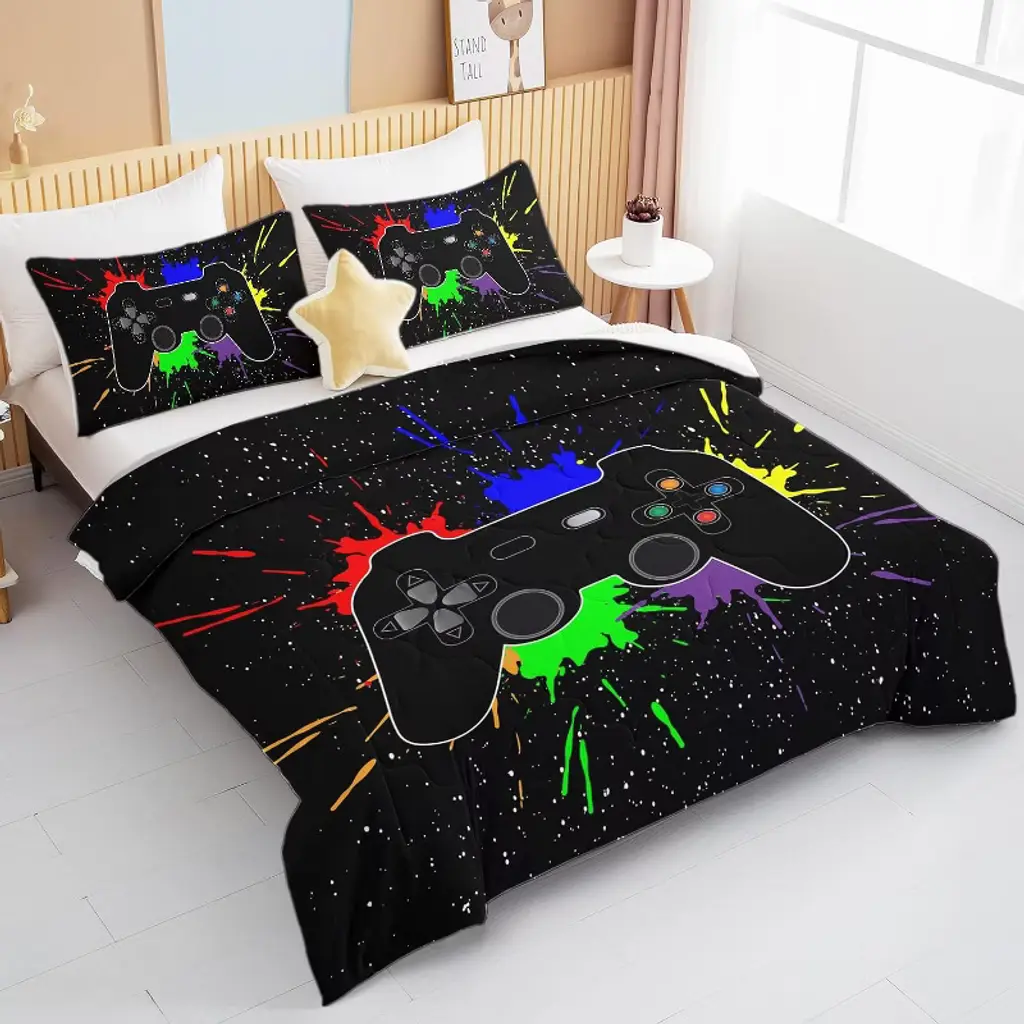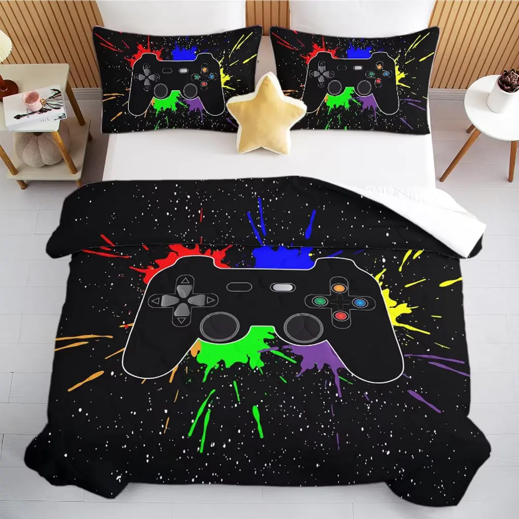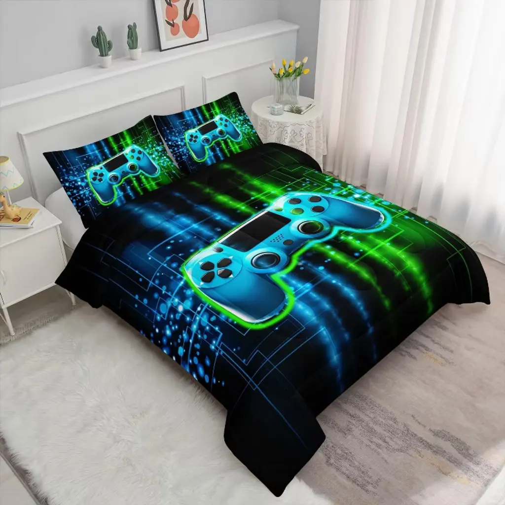 Bring gaming excitement to bedtime with this vibrant 3-piece bedding set! The bold 3D controller design in energetic colors transforms any bedroom into a gamer's paradise. Crafted from premium fabric that stays soft wash after wash, this set includes a generously sized comforter (104"x90") and two matching pillow shams (36"x26"). The lightweight yet cozy construction makes it perfect for year-round use, while the fade-resistant printing ensures long-lasting vibrancy. Easy to care for and fun to use, it's ideal for kids who love gaming and parents who value both style and practicality.