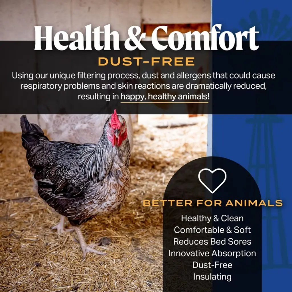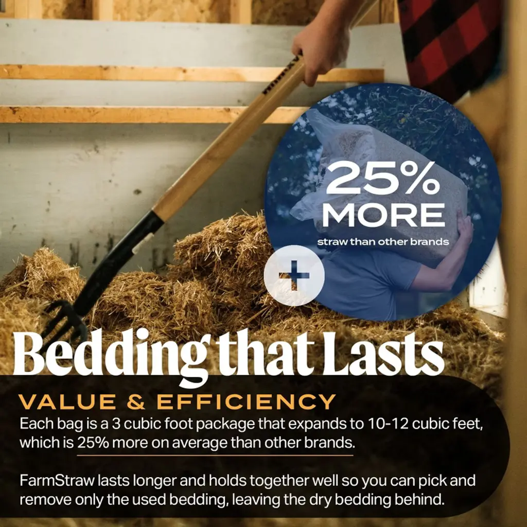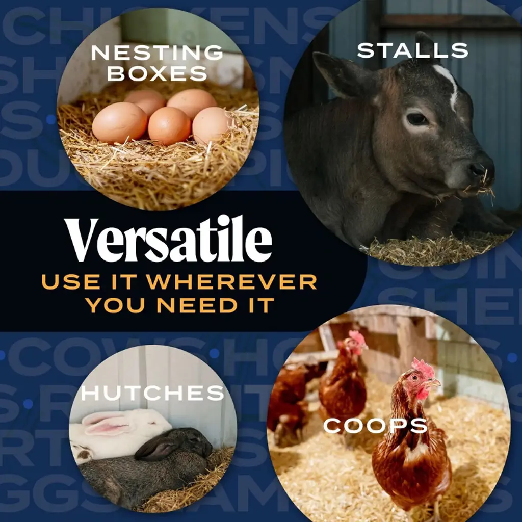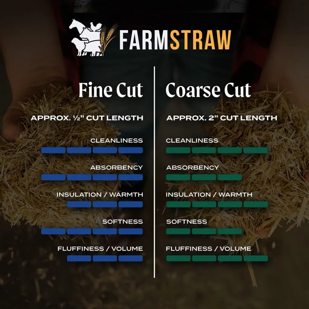 FarmStraw Fine Cut is a premium, all-natural animal bedding designed for homesteads and hobby farms. Made from 100% renewable wheat straw, it is cut to approximately 0.5 inches and meticulously cleaned to remove dust and impurities, creating a virtually dust-free, low-allergen product that protects respiratory health. This fine cut offers exceptional absorption, odor control, and softness, making it ideal for a wide range of farm animals, small pets, and specific needs like calving, foaling, and farrowing. Its unique design wicks moisture downward and absorbs from the bottom up, keeping bedding dry, fresh, and comfortable while promoting healthier skin and improved sleep for animals. Lightweight and compostable, it spreads, removes, and decomposes easily, enriching soil up to four times faster than wood-based bedding. Your Animals: Happier. Healthier. Energized.