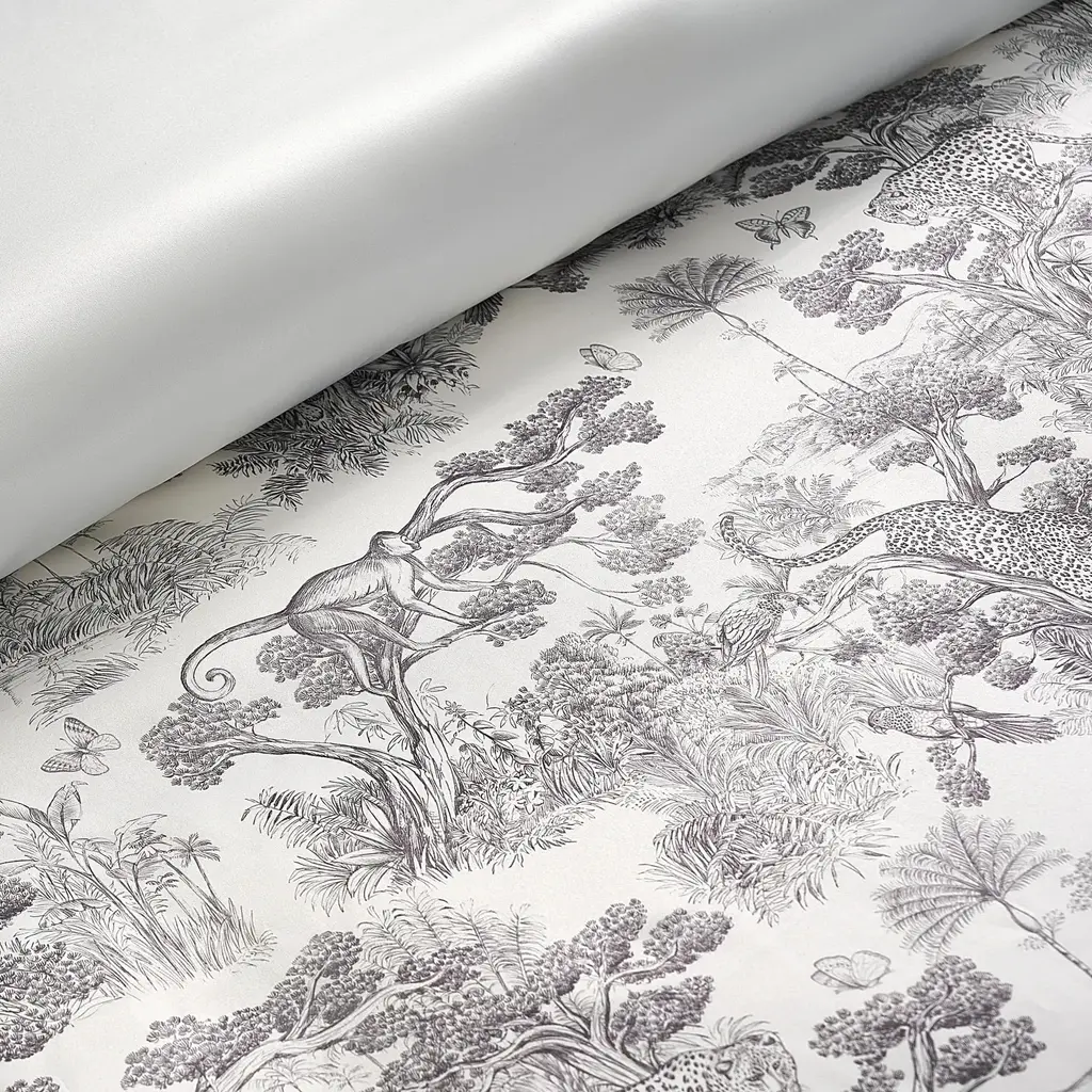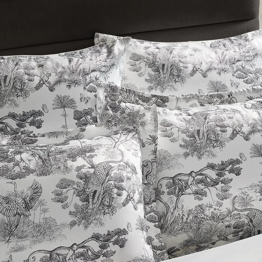 Discover the allure of the Jungle Toile Bedding Collection, where refined elegance meets exotic beauty. The delicate black jungle print on an ivory background adds mystery and romance, with a luxurious sheen that invites touch. Thoughtful details like a 2” flange edge and button closure complete the look. Each set includes a duvet cover and two shams, with optional Euro shams sold separately. Transform your space into a sophisticated escape with Jungle Toile.Z Gallerie exclusive