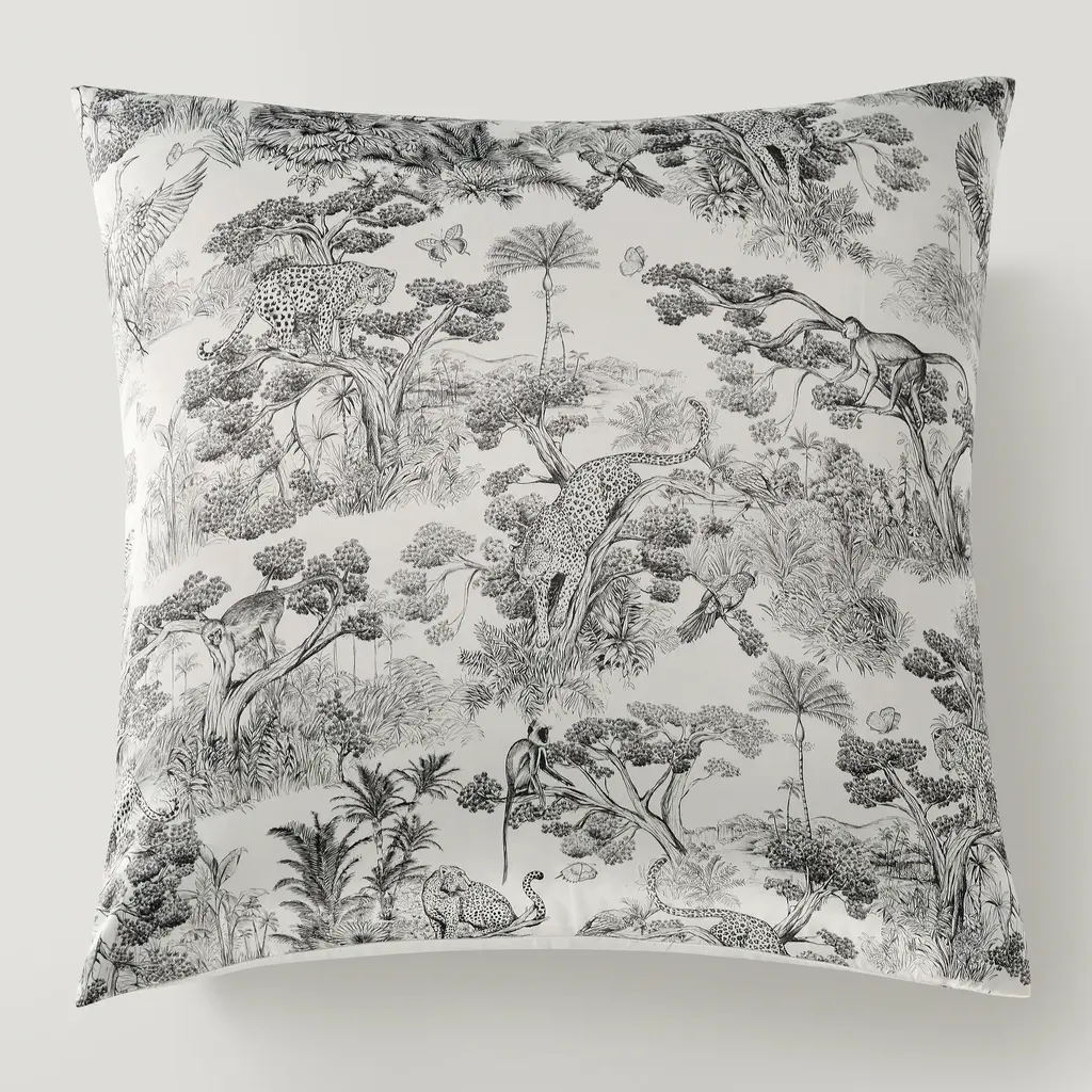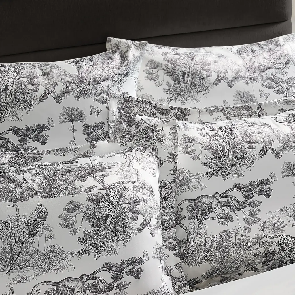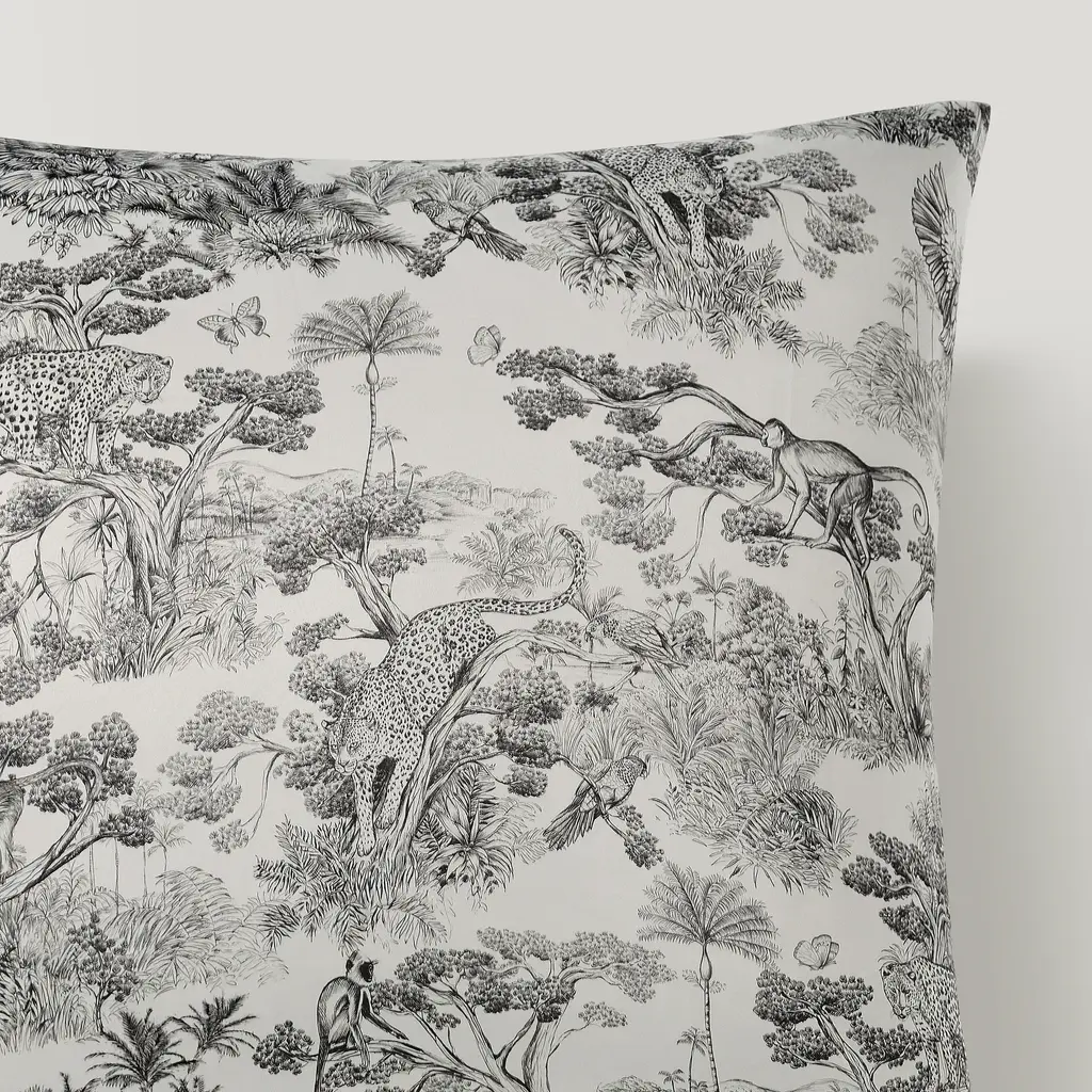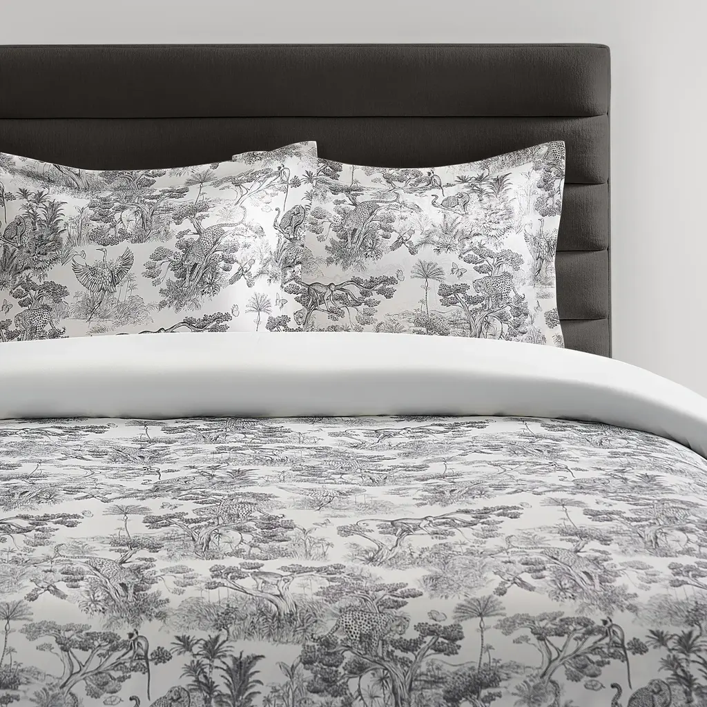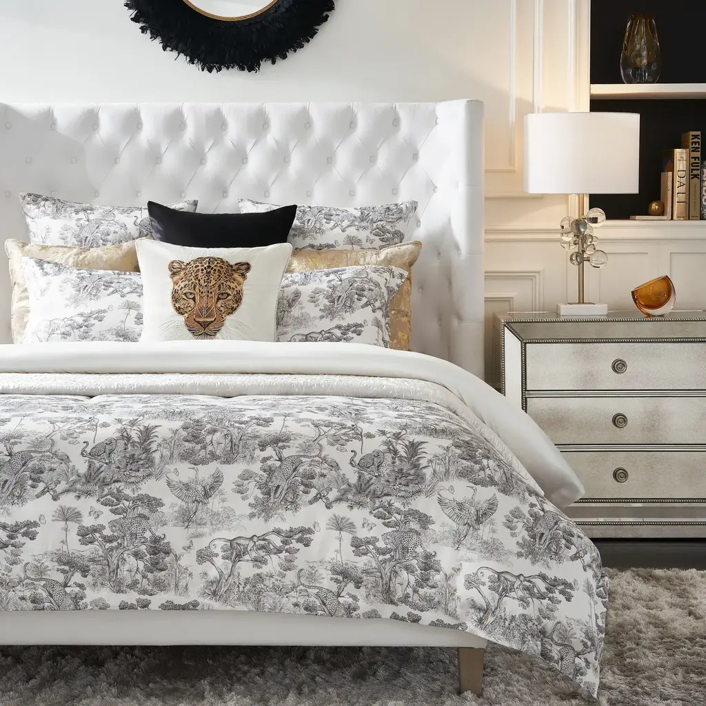 Discover the allure of the Jungle Toile Bedding Collection, where refined elegance meets exotic beauty. The delicate black jungle print on an ivory background adds mystery and romance, with a luxurious sheen that invites touch. Thoughtful details like a 2” flange edge and button closure complete the look. Each set includes a duvet cover and two shams, with optional Euro shams sold separately. Transform your space into a sophisticated escape with Jungle Toile. Z Gallerie exclusive