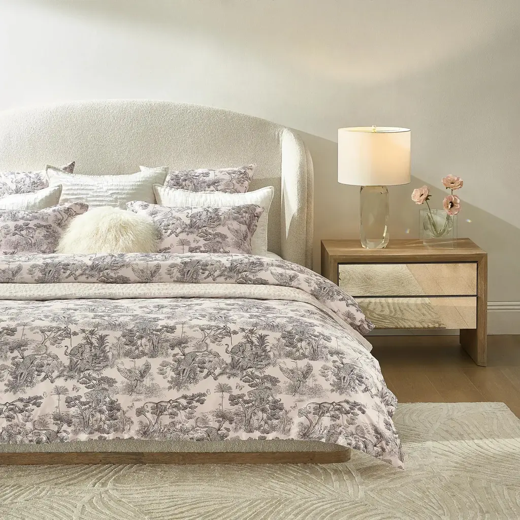 Discover the allure of the Jungle Toile Bedding Collection, where refined elegance meets exotic beauty. The delicate black jungle print on a pale pink background adds mystery and romance, with a luxurious sheen that invites touch. Thoughtful details like a 2” flange edge and button closure complete the look. Each set includes a duvet cover and two shams, with optional Euro shams sold separately. Transform your space into a sophisticated escape with Jungle Toile.Z Gallerie Exclusive