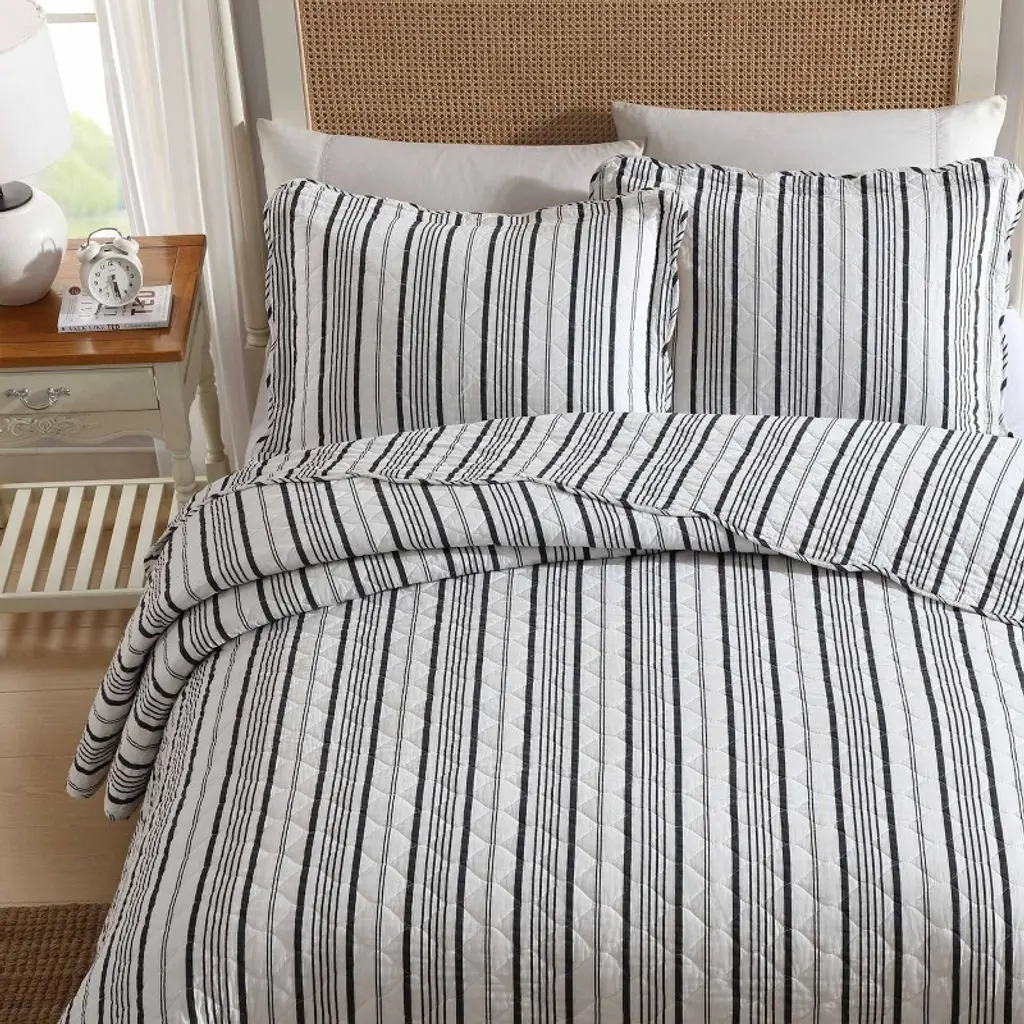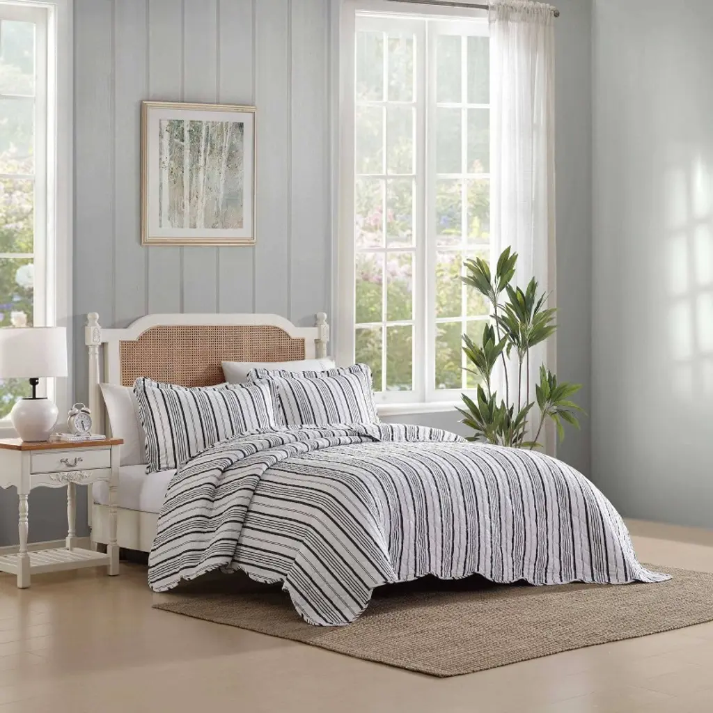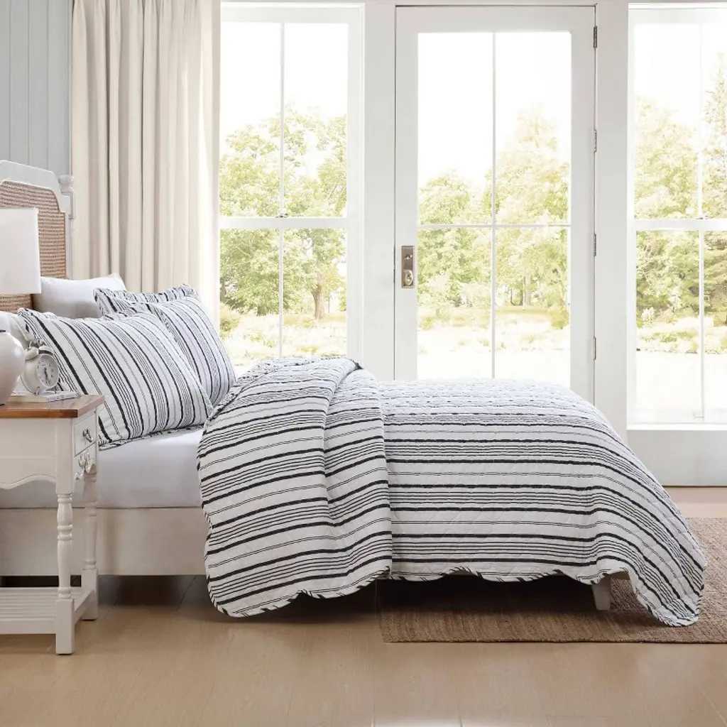 The Laura Ashley Stripe Perfection scallop edge quilt set adds a cozy, stylish touch to your bedroom with its classic striped design in charcoal grey on a crisp white background. This quilt exudes Nautical charm while maintaining a clean, timeless aesthetic. Pre-washed for extra softness, the 100% cotton quilt becomes even cozier with each wash. Its lightweight construction makes it ideal for layering, offering comfort for year-round use. The set includes one quilt and two shams (one for twin size). Machine washable for easy care, this quilt set seamlessly combines style, comfort, and practicality.
