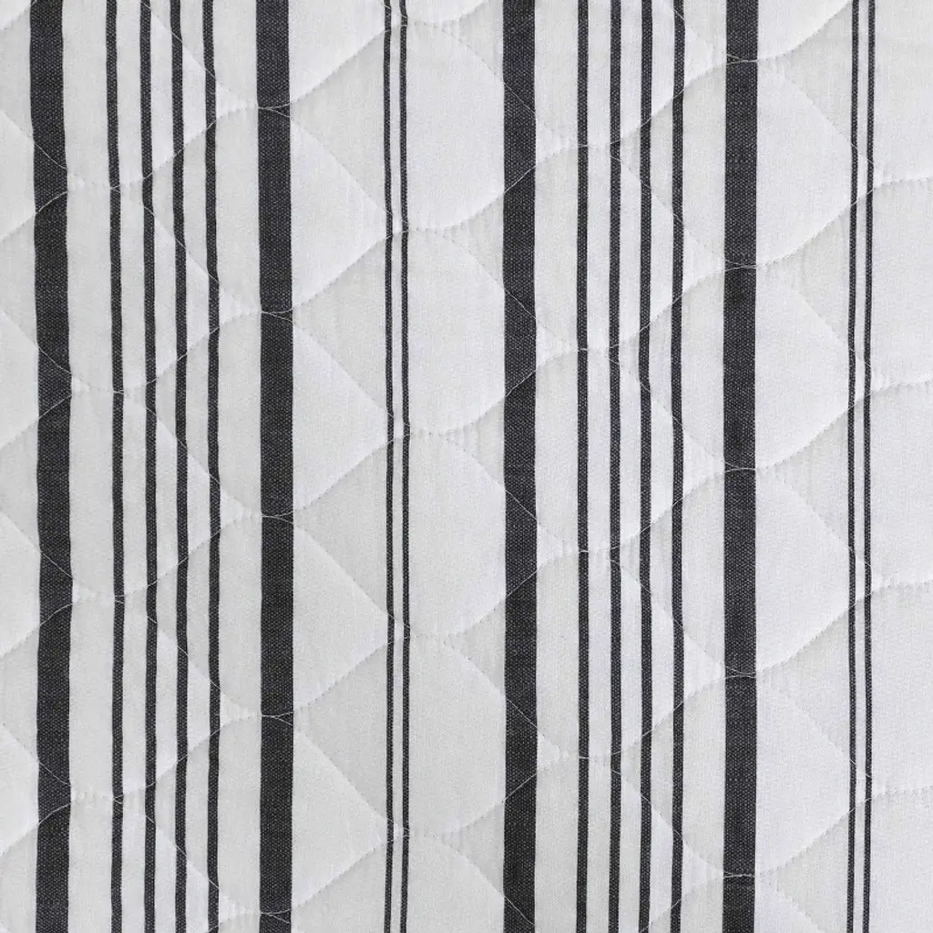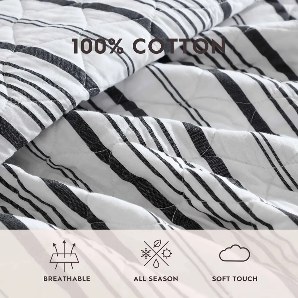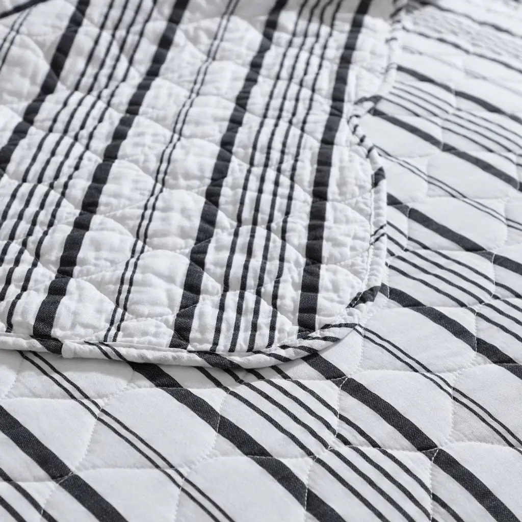 The Laura Ashley Stripe Perfection scallop edge quilt set adds a cozy, stylish touch to your bedroom with its classic striped design in charcoal grey on a crisp white background. This quilt exudes Nautical charm while maintaining a clean, timeless aesthetic. Pre-washed for extra softness, the 100% cotton quilt becomes even cozier with each wash. Its lightweight construction makes it ideal for layering, offering comfort for year-round use. The set includes one quilt and two shams (one for twin size). Machine washable for easy care, this quilt set seamlessly combines style, comfort, and practicality.