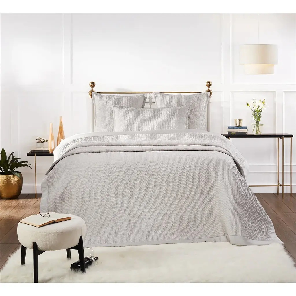 This divine bedding collection features an oh-so-soft channel-stitched silk coverlet and pillow shams. The Lucy collection collaborates beautifully with a spectrum of colors and designs for layering potential. Seriously luxurious! quilt size: (king) 110" wide x 96" long / (queen) 94" wide x 96" long standard sham, cover only: 26" wide x 20" high king sham, cover only: 36" wide x 20" high euro sham, cover only: 26" square 100% silk (front) 100% cotton (back & edging)