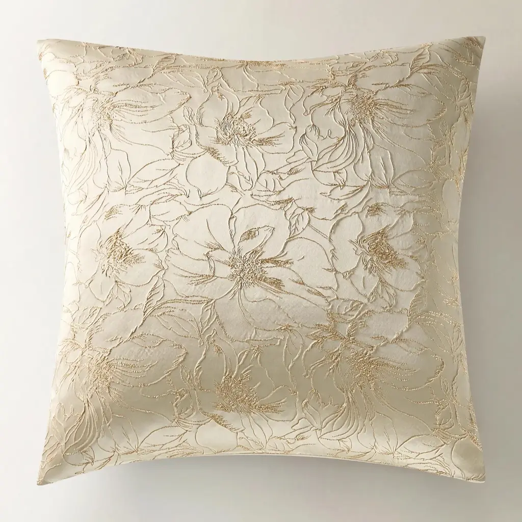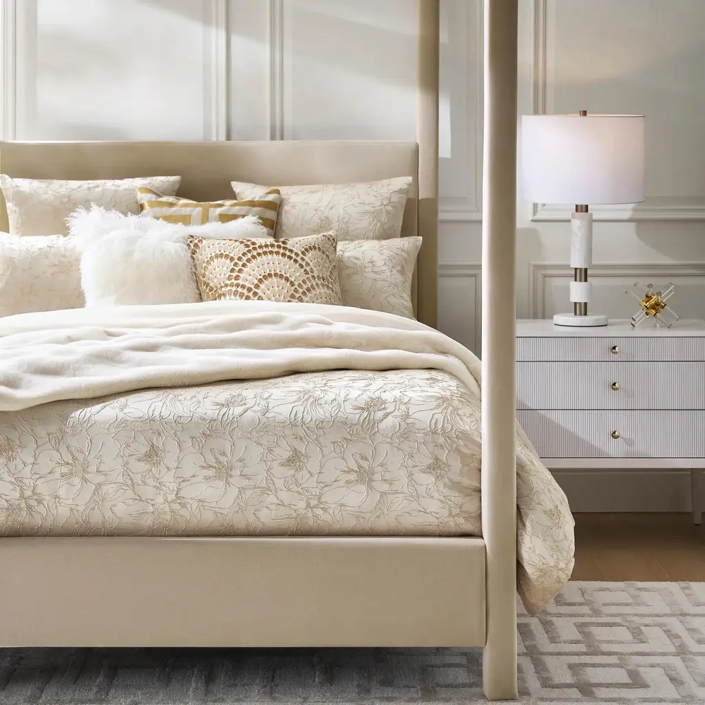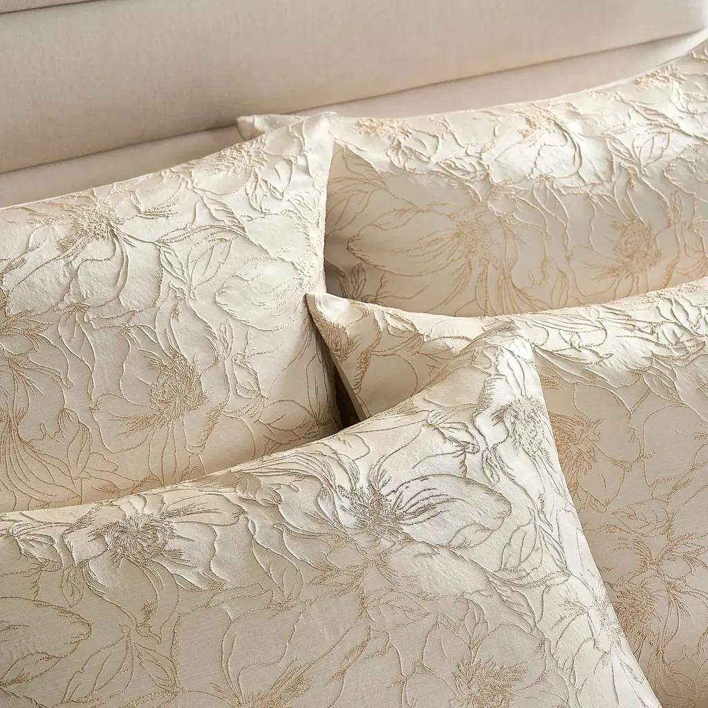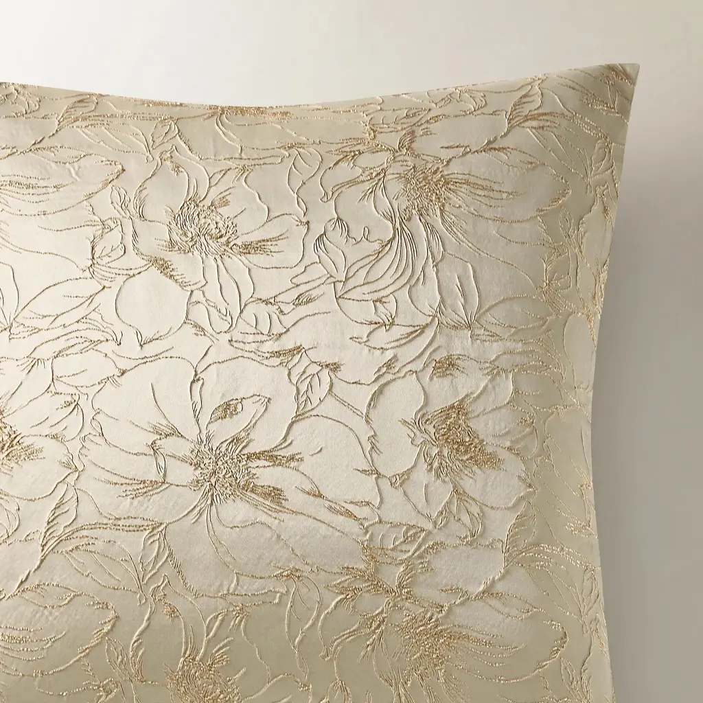Indulge in the opulence of the Mimoza Bedding Collection, where metallic champagne gold jacquard meets delicate tonal floral embroidery for a look of timeless elegance. This luminous fabric catches the light beautifully, creating a warm, inviting glow in your bedroom. With its knife-edge detail and button closure, each piece feels as polished as it looks. The set includes a duvet cover and two shams, with Euro shams available separately to complete the look. Elevate your space with Mimoza—a touch of luxury and romance for your most cherished retreat.Z Gallerie exclusive