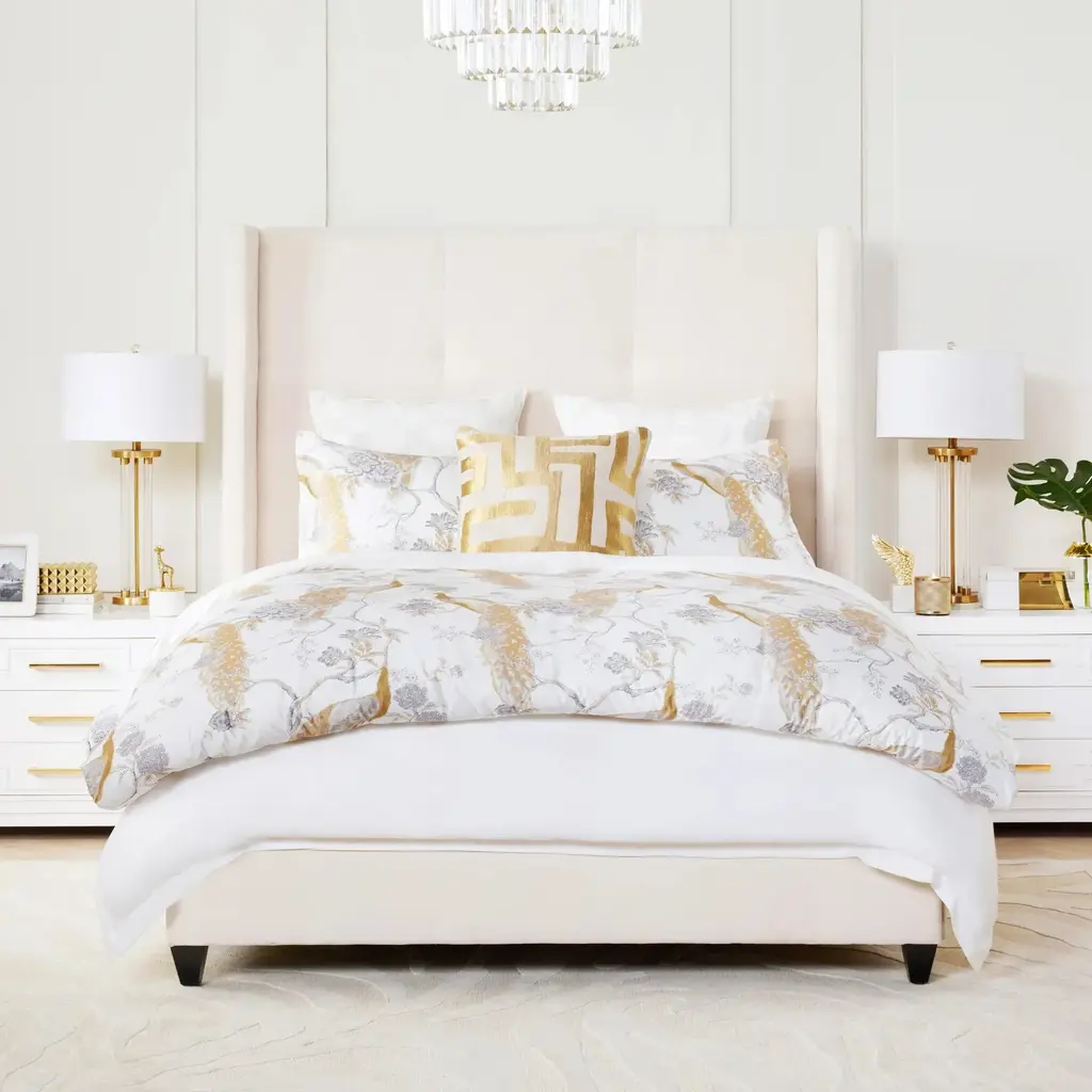 Artfully adorned with blooming branches and perched peacocks, our Pavo Collection is ideal for bringing a colorful, classical note to the bed. Made from lightweight, machine-washable satin in long-lasting, richly saturated hues, the bedding in this collection resists shrinking and fading while being silky soft to the touch with a glamorous sheen.Z Gallerie exclusive