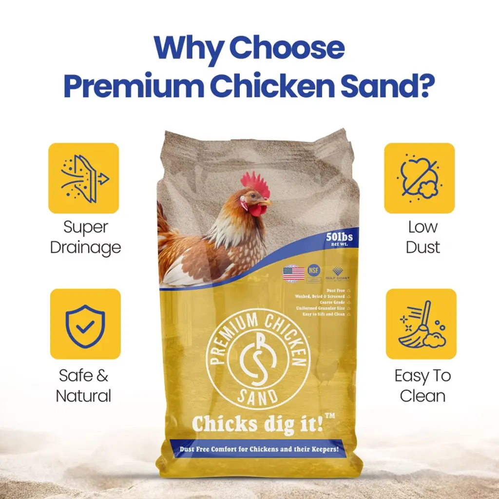 Elevate the well-being of your feathered friends with Premium Chicken Sand, the all-natural bedding that sets the standard for poultry care. Crafted with meticulous attention to detail, this 50-lb bag of premium-quality sand is designed to transform your chicken coop into a clean, fresh, and inviting environment that your flock will thrive in. Harnessing the power of nature, this poultry sand utilizes the exceptional absorbency and odor-controlling properties of pure, high-grade sand. Unlike traditional bedding options that can quickly become damp and smelly, this innovative product effectively traps and eliminates unpleasant odors, keeping your coop fresh and your chickens comfortable. Its unique formula includes a blend of natural ingredients that not only absorb moisture but ensure a clean and healthy living space for your beloved birds. Soft yet sturdy sand granules are gentle on your chickens’ feet, reducing the risk of foot problems like bumblefoot. Designed with the modern chicken keeper in mind, this product is easy to use and maintain. Its fine, dust-free texture makes it simple to spread and distribute evenly, while its long-lasting performance means you'll spend less time on tedious coop cleanups. Whether you're a seasoned chicken enthusiast or just starting your poultry journey, Premium Chicken Sand is the solution you've been searching for.