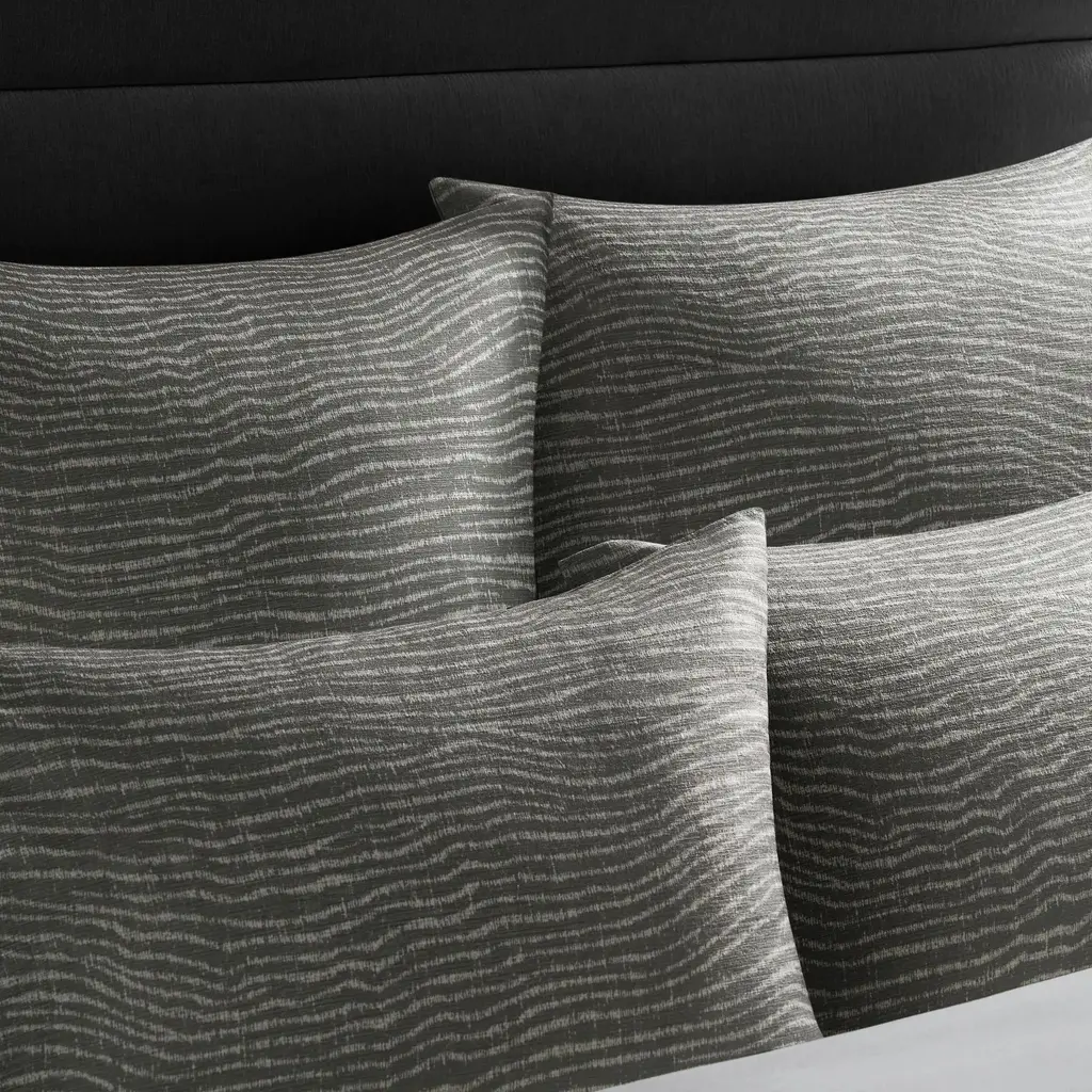 Discover serene elegance with the Sahara Bedding Collection, featuring a subtle wave-inspired zebra print in calming charcoal tones. The soft jacquard fabric and refined knife-edge detail bring modern sophistication, while a button closure on the duvet and envelope shams add ease. Each set includes a duvet cover and two shams, with Euro shams sold separately for a complete look. Let Sahara transform your space with understated beauty.Z Gallerie Exclusive