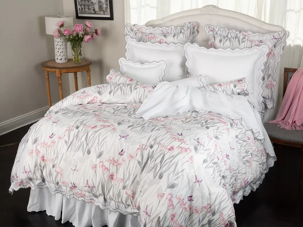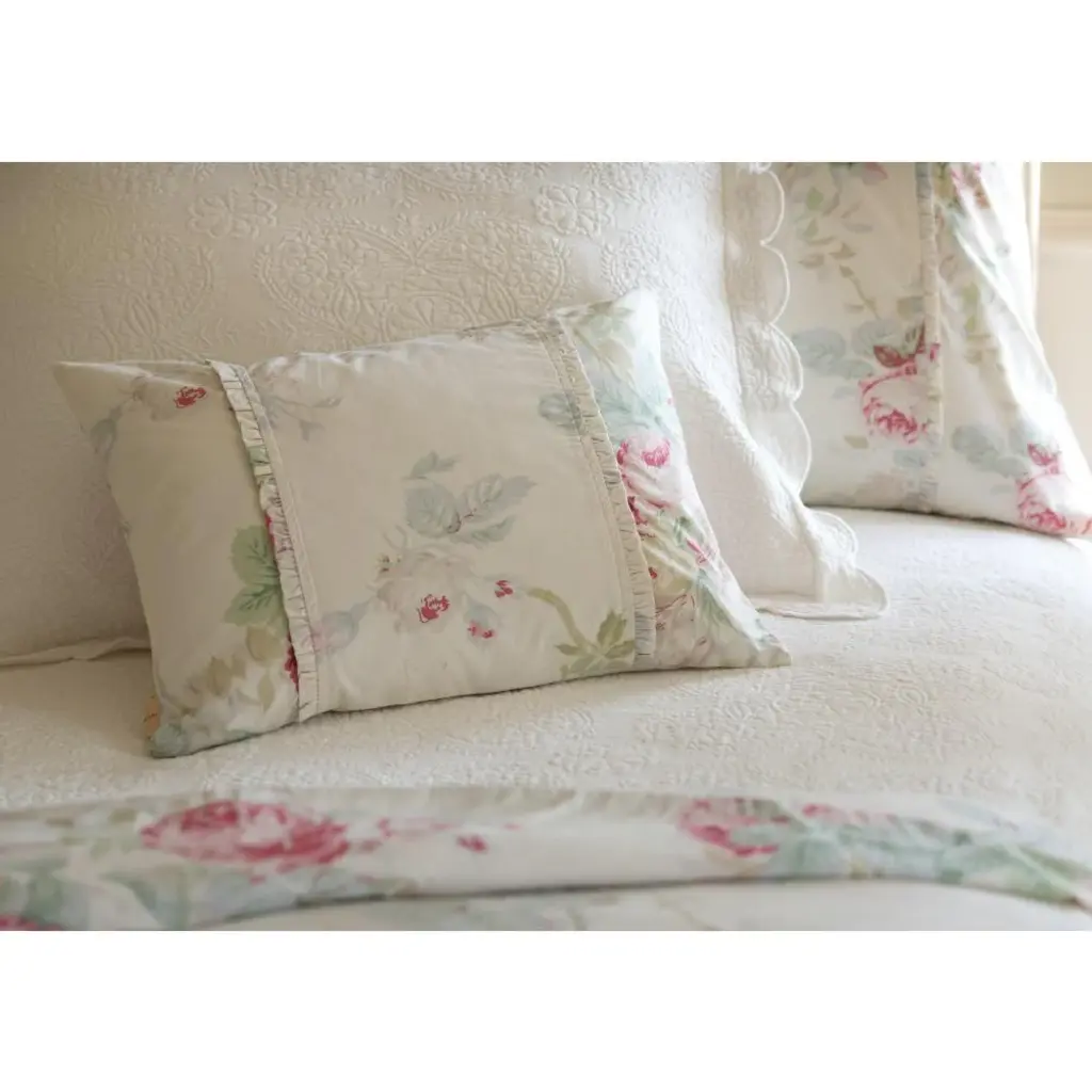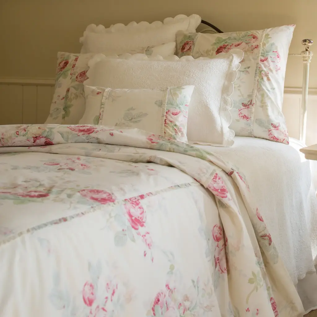 Charming shabby chic cabbage roses are scattered over a soothing cream background on an exceptionally soft Shore Rose duvet and shams. duvet sizes: (king) 104″ wide x 90″ long / (queen) 90" wide x 90″ long / (twin) 68″ wide x 86″ long standard sham: 27" wide x 21" high king sham,100% white feather/down: 35" wide x 23" high euro sham: 26" square boudoir pillow,100% white feather/down: 18" wide x 13" high porch pillow,100% white feather/down: 21" square 100% cotton