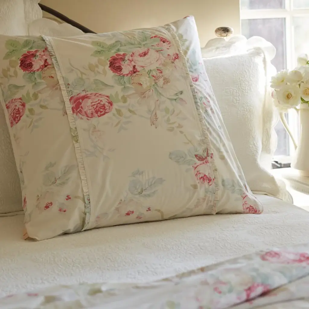 Charming shabby chic cabbage roses are scattered over a soothing cream background on an exceptionally soft Shore Rose duvet and shams. duvet sizes: (king) 104″ wide x 90″ long / (queen) 90" wide x 90″ long / (twin) 68″ wide x 86″ long standard sham: 27" wide x 21" high king sham,100% white feather/down: 35" wide x 23" high euro sham: 26" square boudoir pillow,100% white feather/down: 18" wide x 13" high porch pillow,100% white feather/down: 21" square 100% cotton