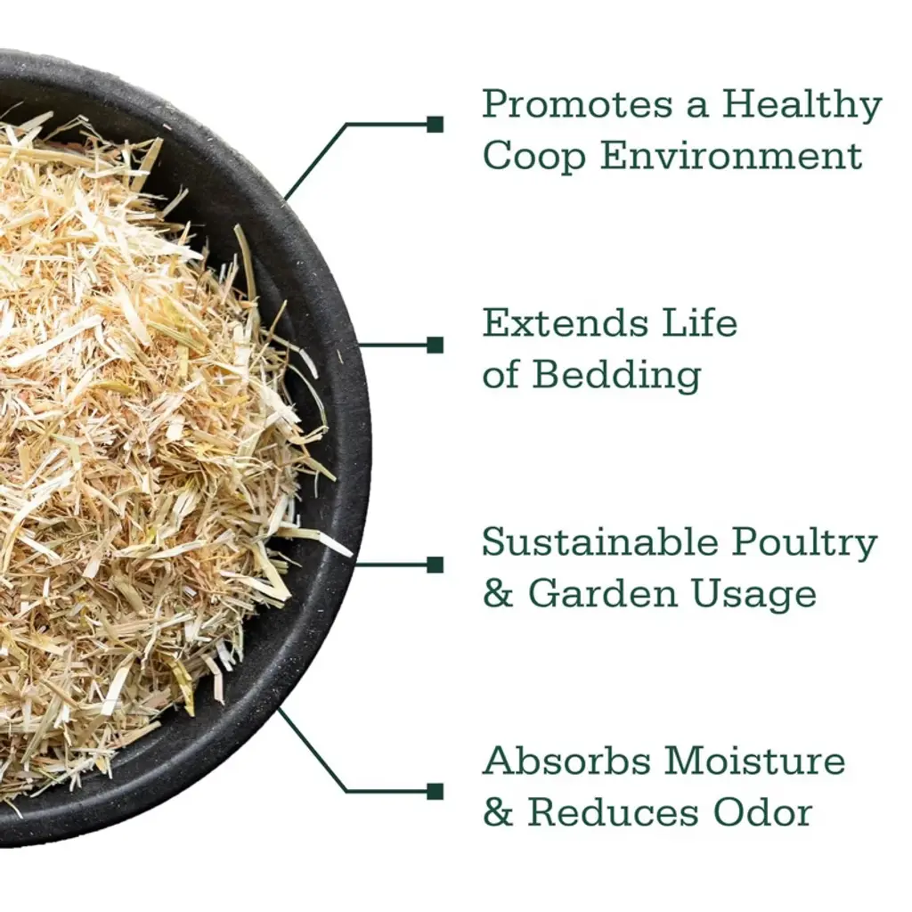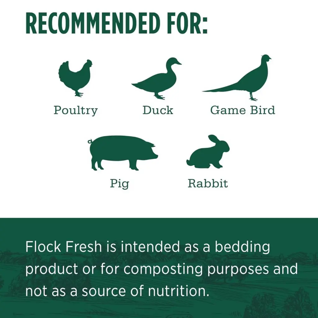 Standlee premium western forage flock fresh is an all-natural bedding mixture. Scientifically formulated, flock fresh reduces ammonia odors, promotes digestive health and creates a comfortable, dry and a nearly odor-free Roosting area. Flock fresh is made with premium chopped straw, premium chopped alfalfa and zeolite granules. The mix is composed primarily of chopped straw and enhanced with zeolite granules. Alfalfa is added to encourage your flock to peck through and continually turn the bedding. This activity and comfort promotes a happy and healthy coop environment. Flock fresh is recommended for chickens, Ducks, game birds, pigs & other small animals. Additionally, used flock fresh is ideal for composting. Get amazing results in your flower beds and gardens without the use of chemicals.