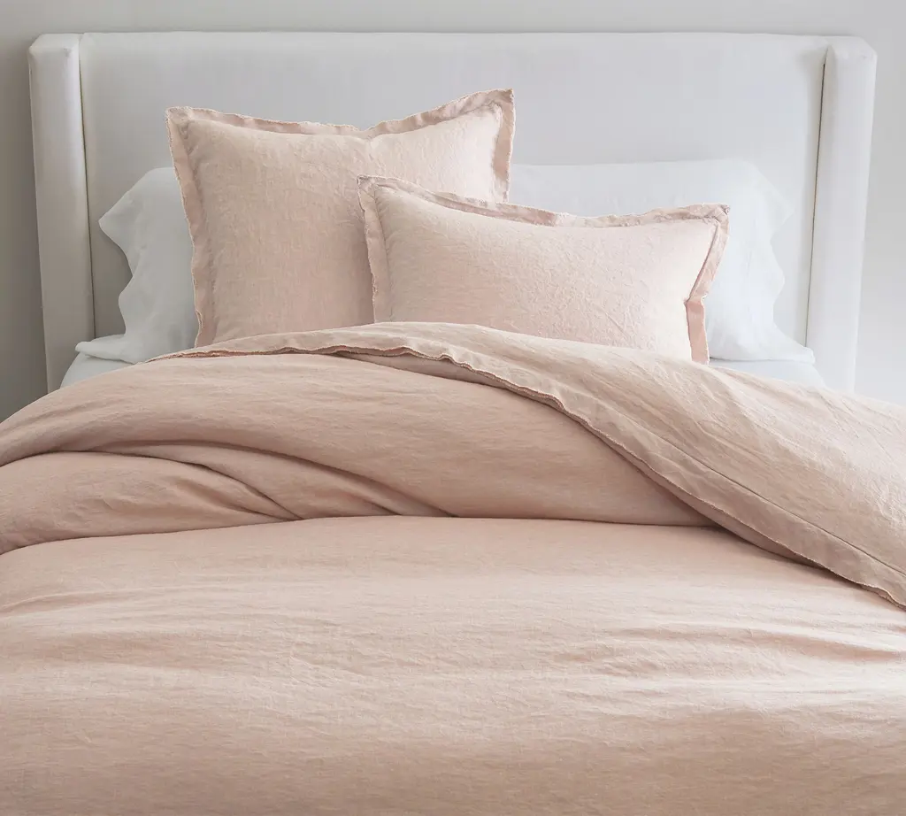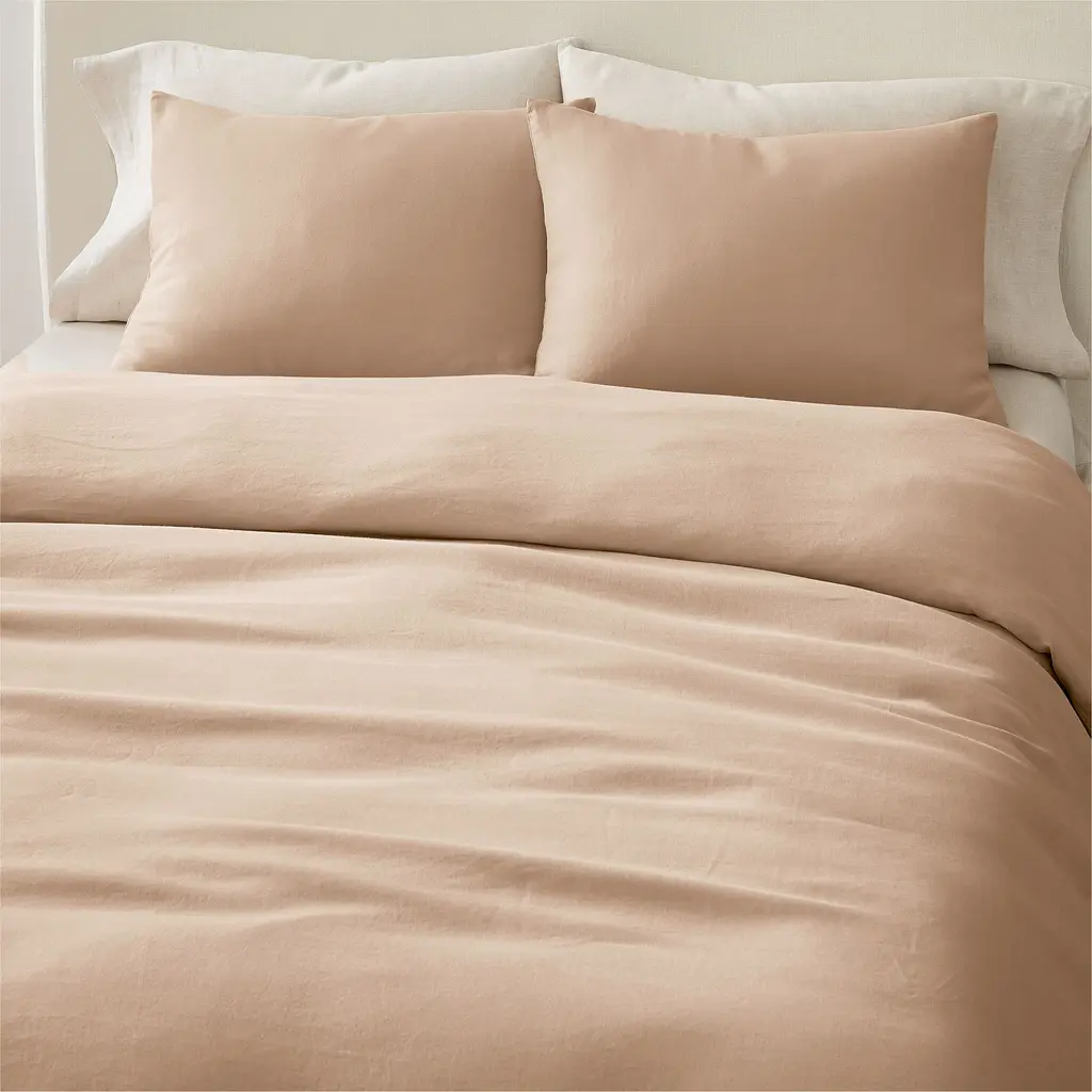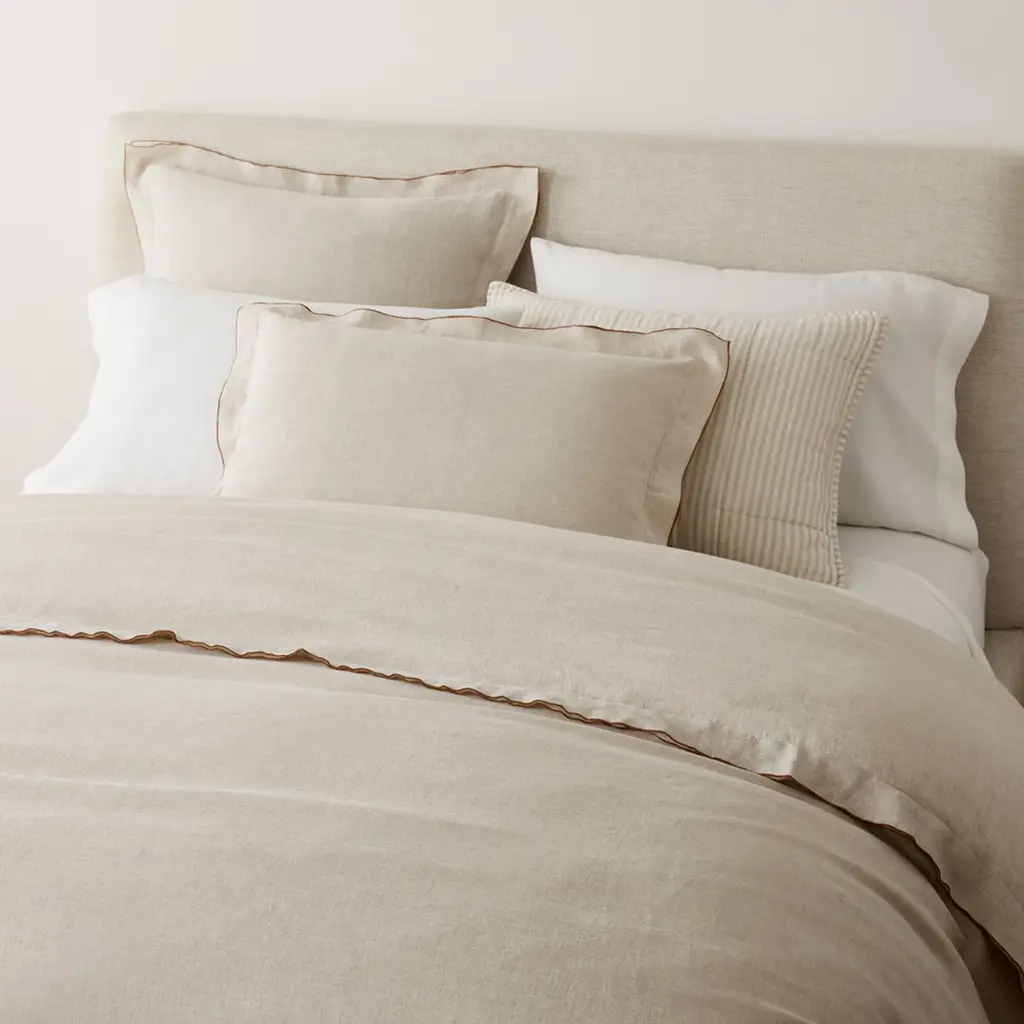 Soft sand stripe combines with warm camel for a statement bedroom look. Curated by The Citizenry design team, this set is warm, earthy, and effortlessly stunning. The organic texture of French linen takes on a calming look in soft sand stripe and dusty camel. Breathable, durable, and so-very-soft, this garment-washed linen set will have you wishing you could snooze a little longer. Set includes: - 1 Sheet Set - Camel (1 flat sheet, 1 fitted sheet, 2 pillowcases) - 1 Duvet Cover - Sand Stripe - 2 Extra Pillowcases - Sand Stripe Made using only the finest French flax and woven in the oldest, family-run linen mill in Portugal, each piece is Oeko-Tex® certified and made start-to-finish in a fair trade environment. Want to see our bedding for yourself? Go on and test out our linen fabric swatches.