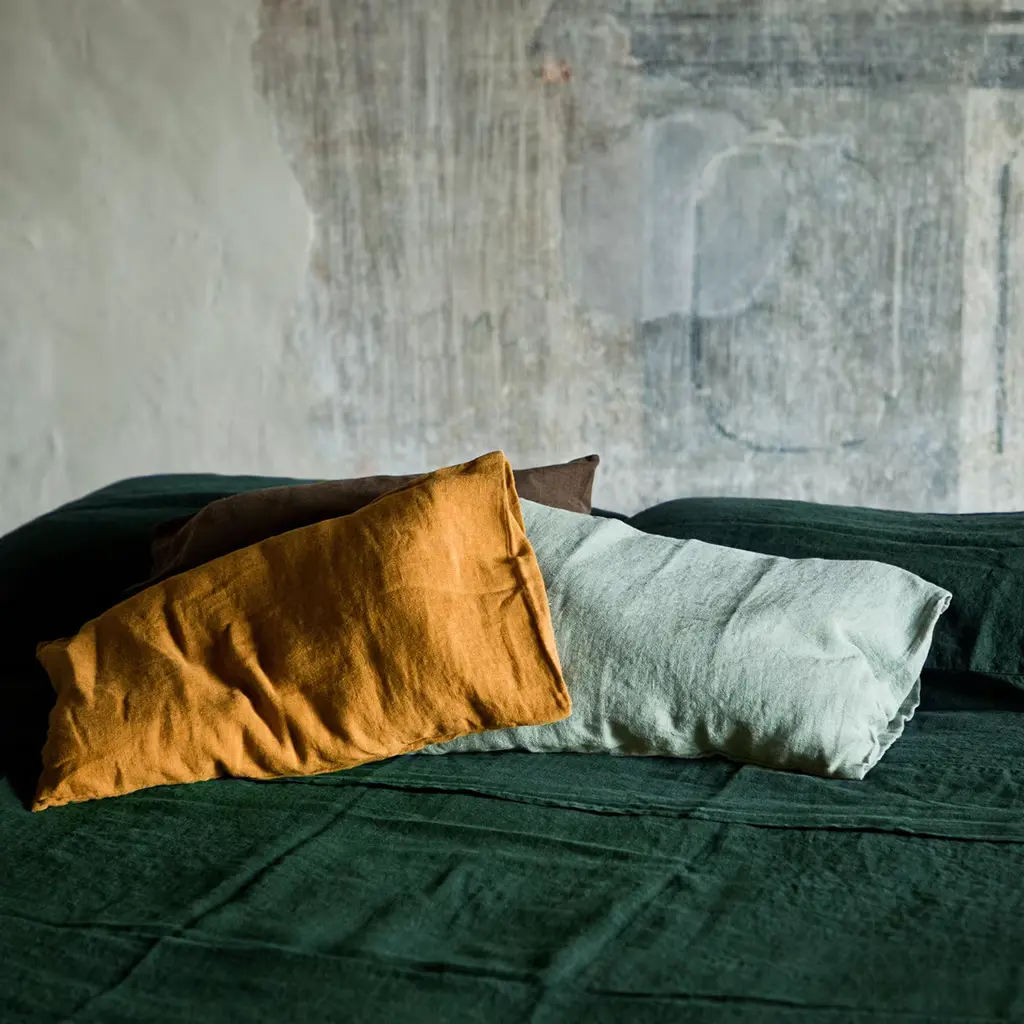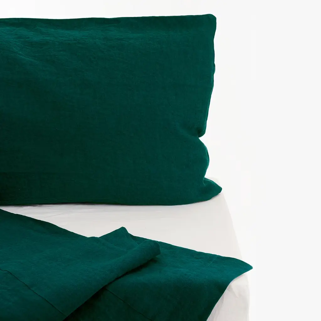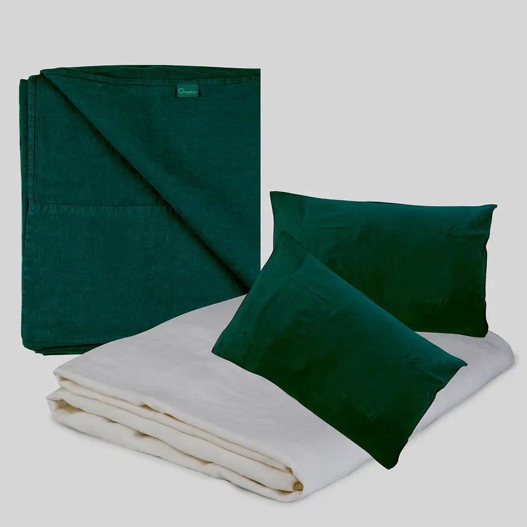 An elegant addition to any home, this linen was crafted of the finest linen entirely by hand. The white fitted sheet and striking forest-green linen top sheet with matching pillowcases create a timeless color combination that will be perfect for an all white bedroom or guest room, adding a pop of color and the subtle sophistication of high quality, light weight linen of 165 gr/sq m. Different sizes are available - please ask the concierge for different pricing in other options.