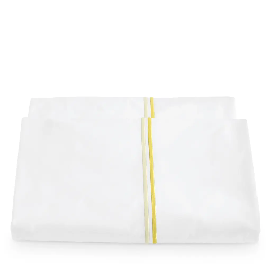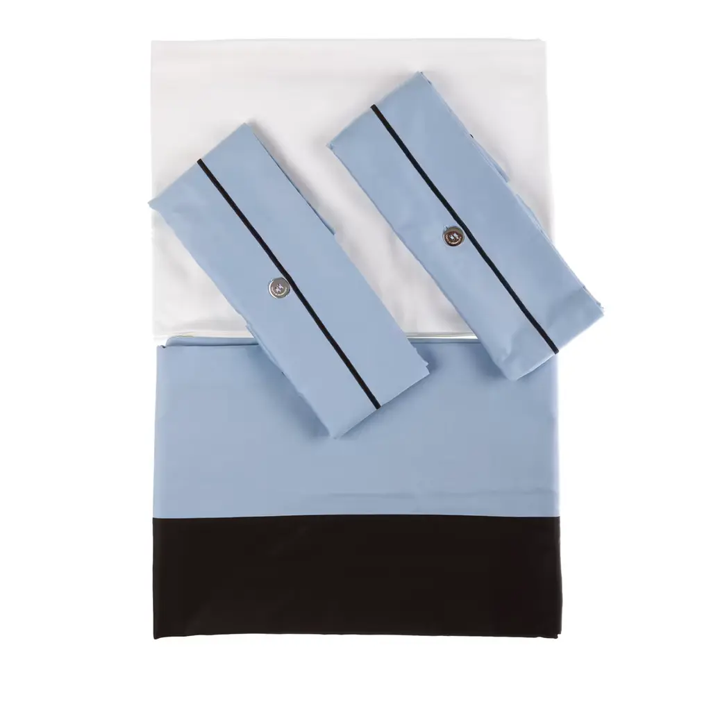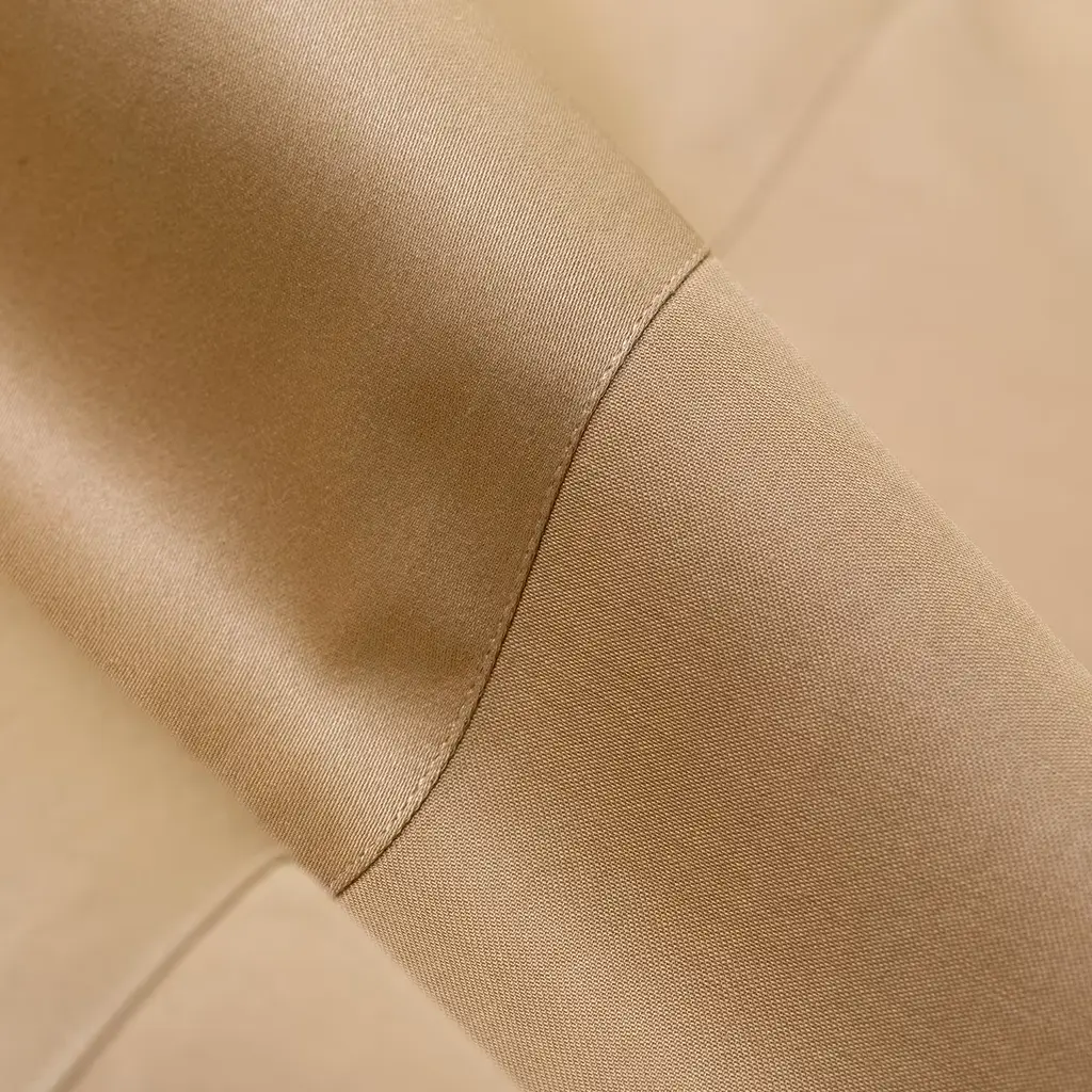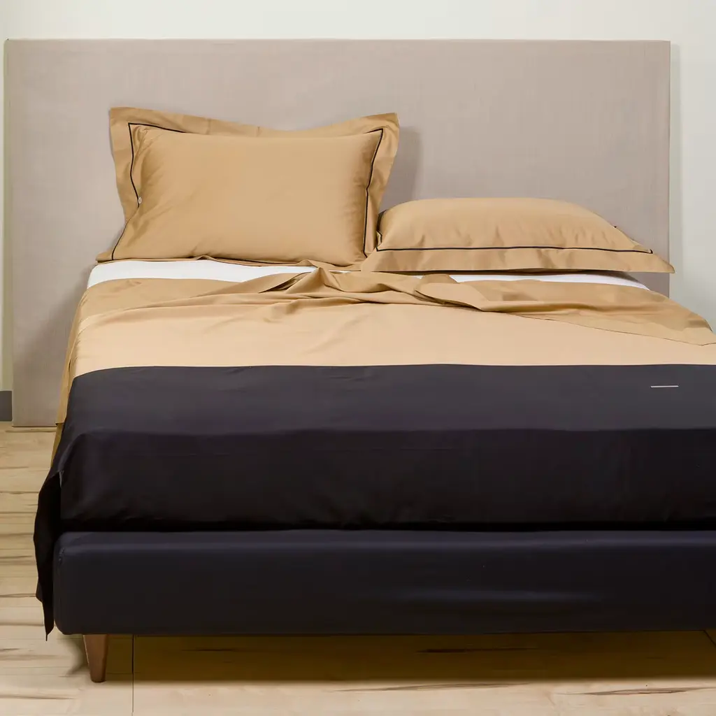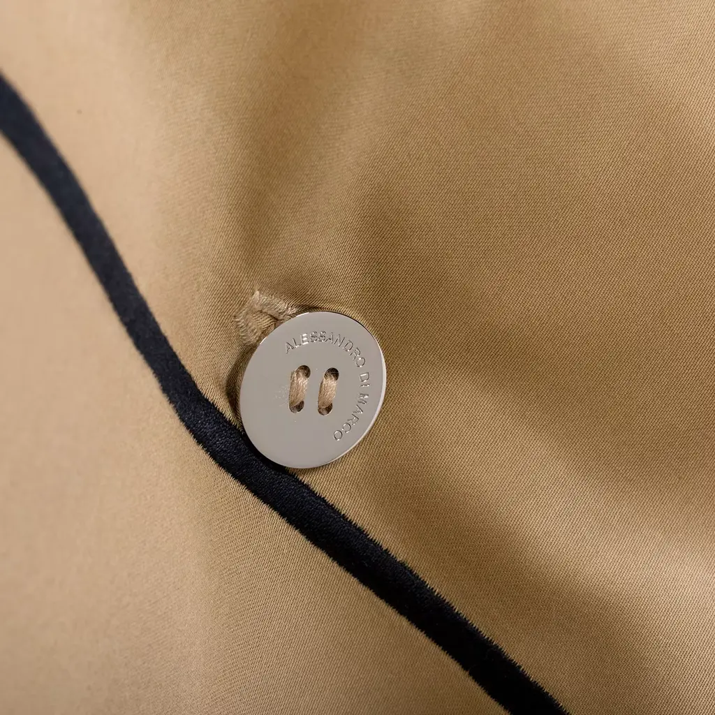 This fine satin bedding set consists of exquisite sheets in beige and black embellished with mitered corners. The pillowcases are in beige satin decorated with black embroidery. The fitted sheet in natural white. 300 thread count combed and mercerised silk dream satin in pure cotton, 110 g/m2. The buttons are in brass and the metal logo plate has been embossed and sports a palladium finish.