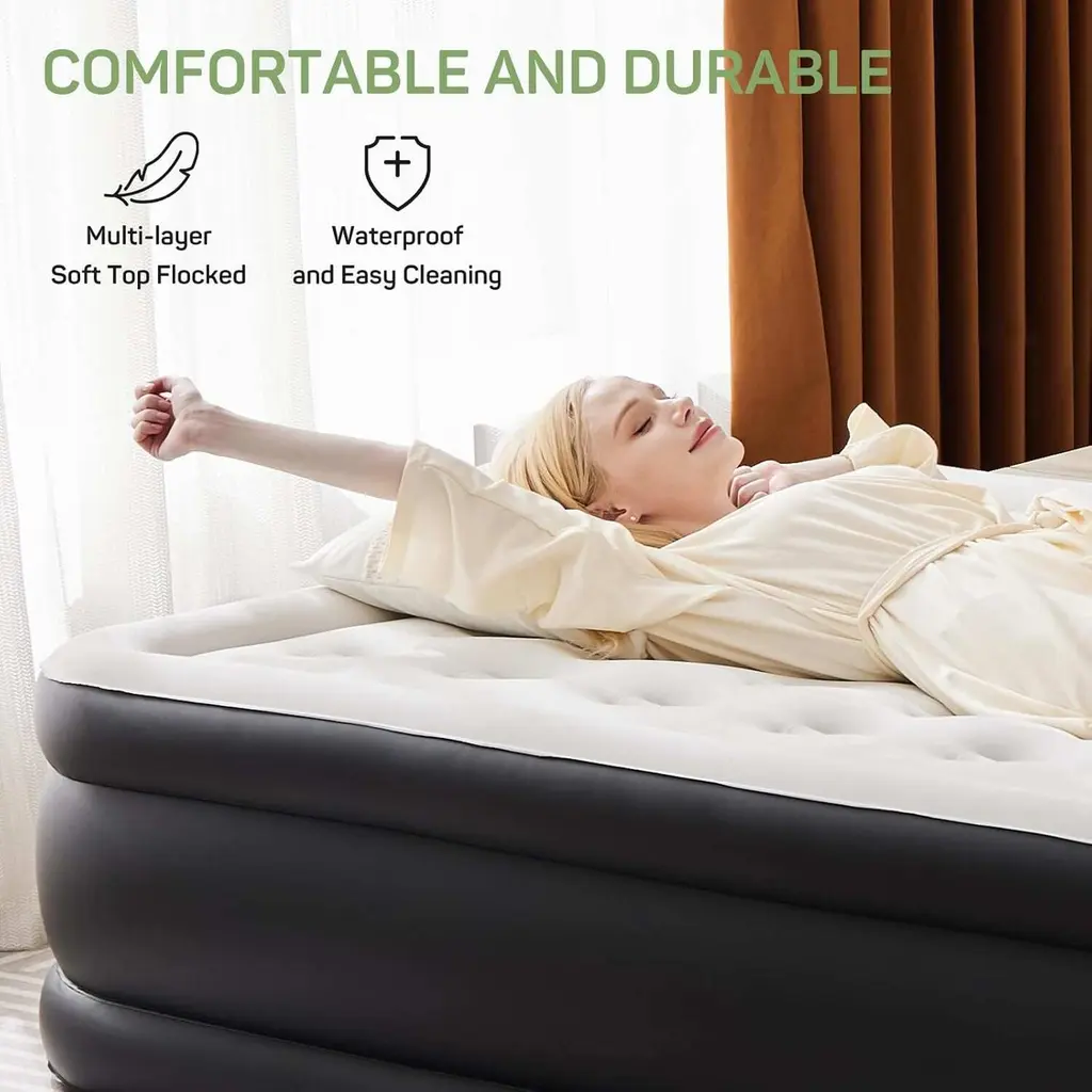 Experience the superior comfort and convenience of our air mattress, designed for indoor and outdoor use. The soft suede top layer provides a gentle touch, making it ideal for a good night's sleep and easy to clean. The non-slip bottom ensures stability and reduces noise, allowing you to move without being disturbed. Our air mattress has an upgraded internal design with elastic honeycomb column support, which can withstand up to 660 lbs. without sagging. The sturdy PVC material is not only scratch-resistant but also maintains its shape. Equipped with a built-in 110-Volt high-power electric pump, inflating or deflation has never been easier. Your air mattress comes with a convenient storage bag that not only protects the mattress but also makes it easy to carry. FEATURES: