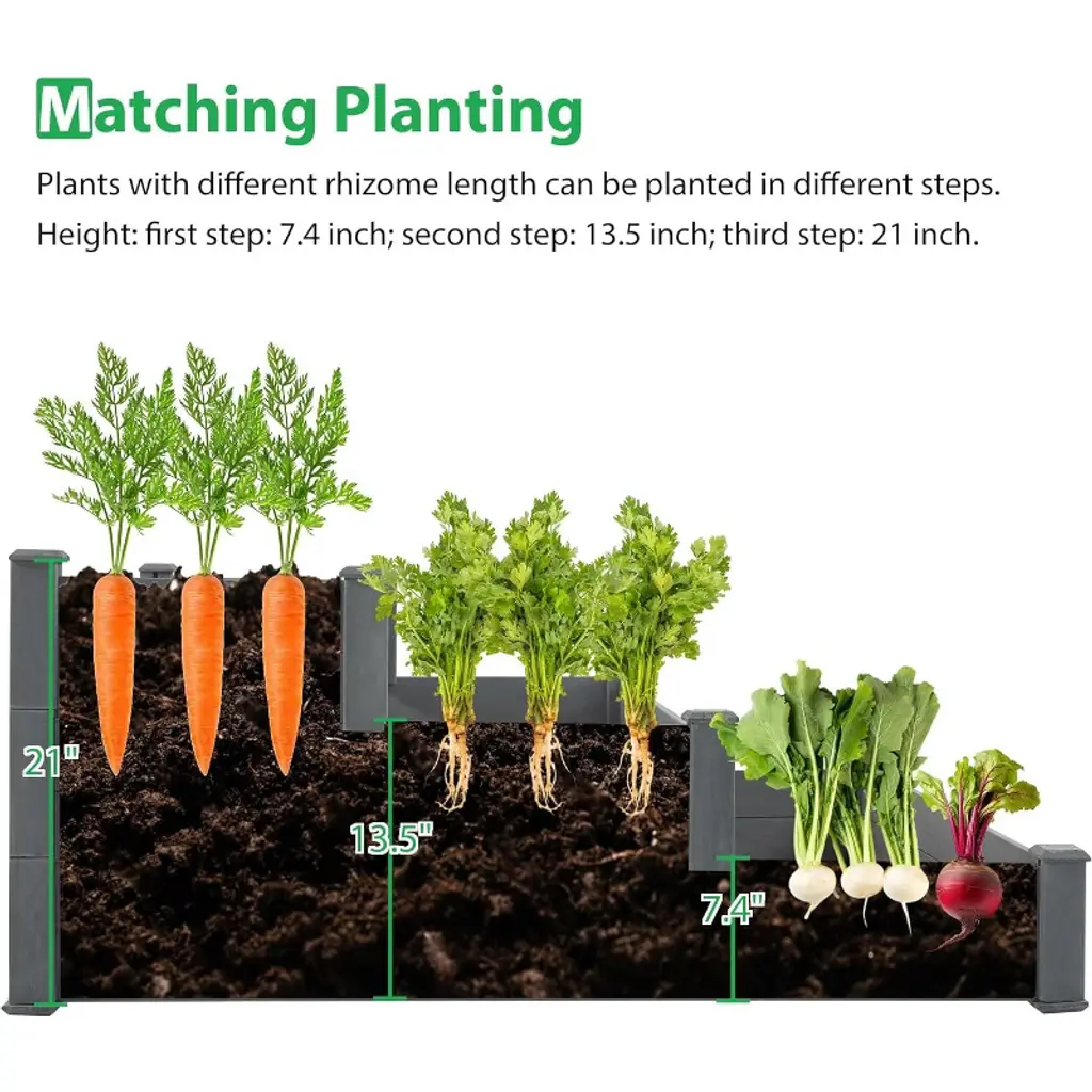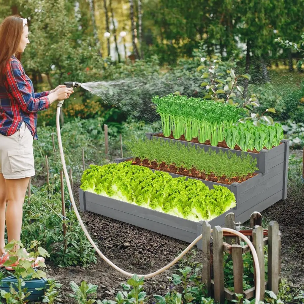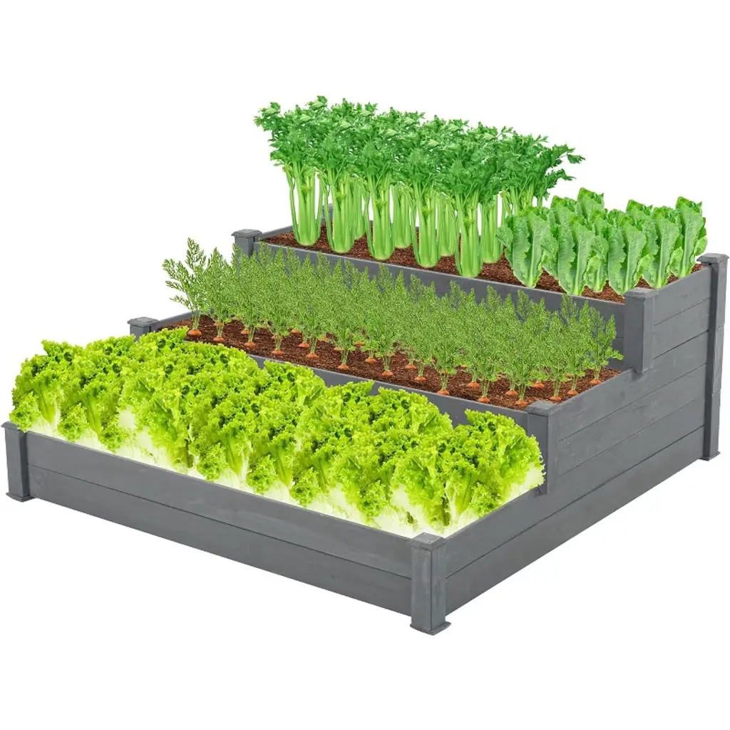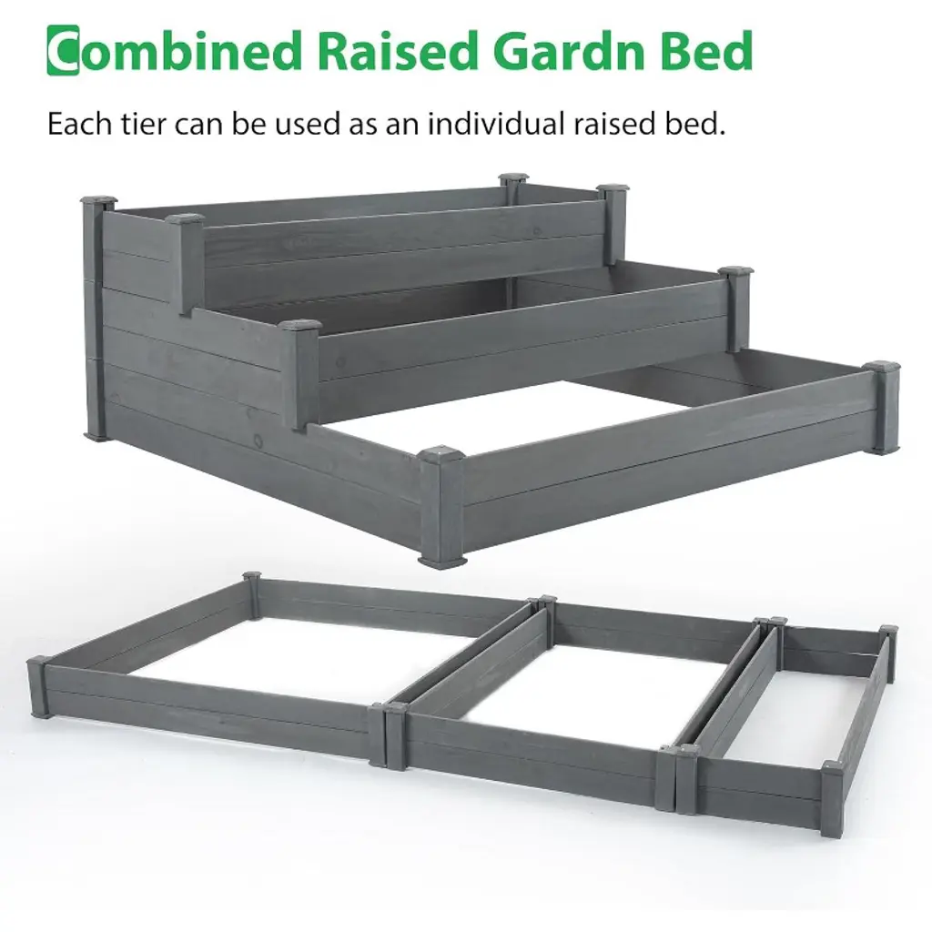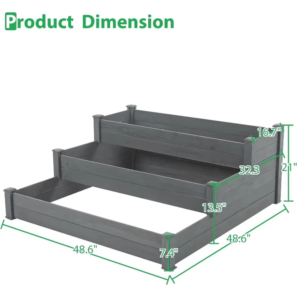 Product DescriptionThis 3-tier wooden raised garden bed offers three planting areas with varying depths (21", 13.5", and 7.4"), ideal for growing vegetables, herbs, flowers, and more. The wood plug connection allows it to be used as one unit or separated into three individual beds. Its open-bottom design supports healthy root growth and efficient drainage. Made from smoothly polished natural wood, it’s perfect for DIY customization with paint or stain. Easy to assemble with clear instructions, this planter adds both beauty and function to your patio, garden, or greenhouse.Product InformationName: Garden BedColor: Grey, BrownStyle: ModernShape: RectangularMaterial: Fir WoodIndoor/Outdoor Usage: OutdoorMounting Type: Floor StandingItem Weight: 24 PoundsProduct Size: 48.6" x 48.6" x 21"(L x W x H)Features: 3-Tier Open BottomPacking list:1x garden bed