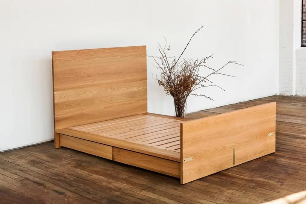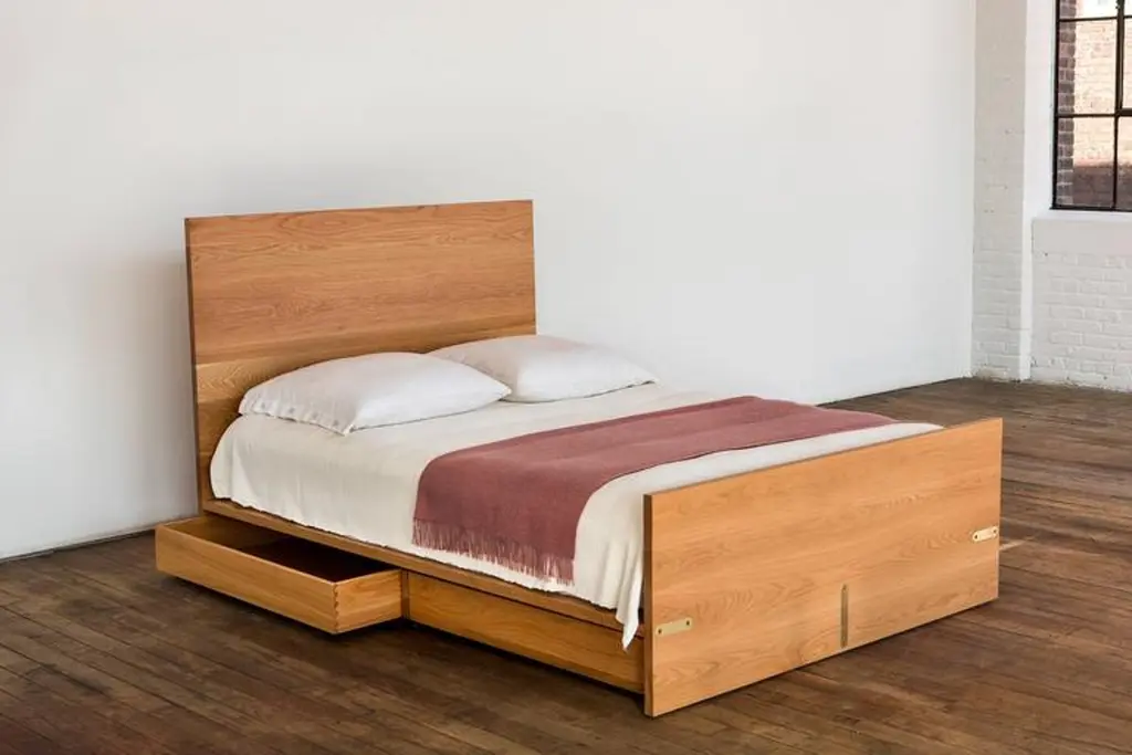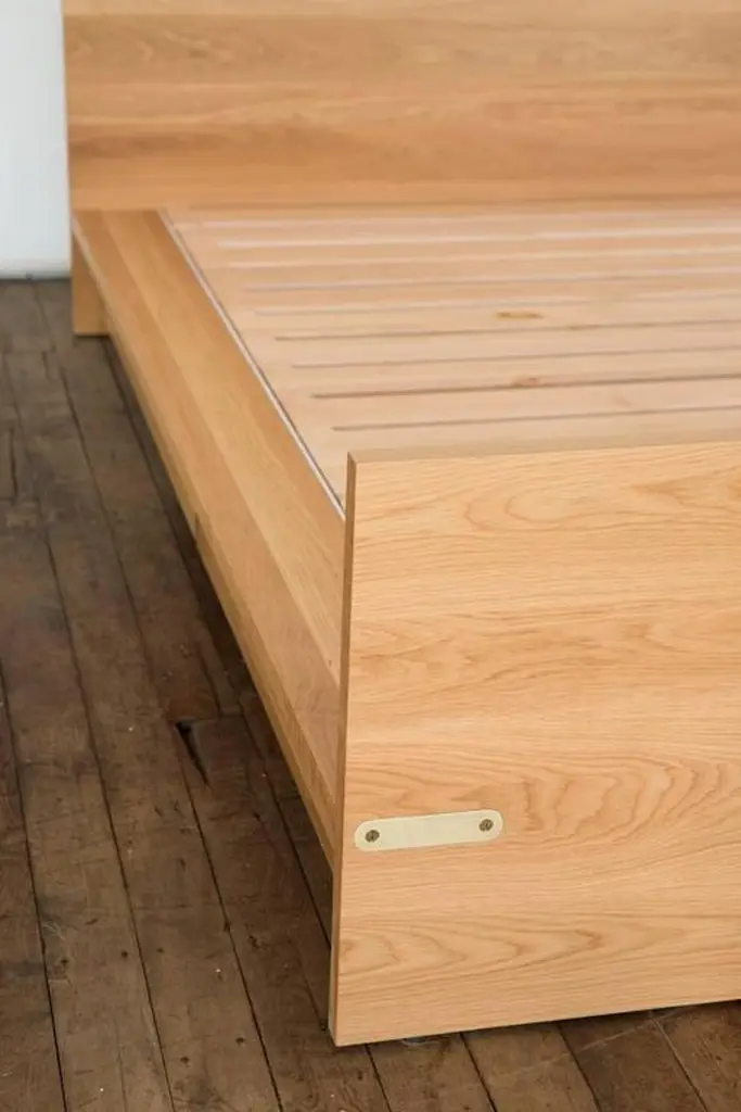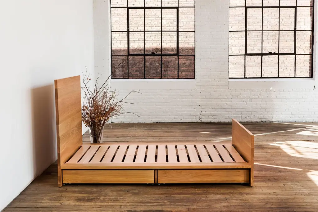 The AB6 bed, an understated platform bed, features discrete storage below (optional) an elegant expanse of solid hardwood. Shown in solid white oak with bronze accents. Dimensions: 60” W x 46” H x 83” L, platform 9.5” HAll of our solid hardwood is sustainably sourced from Pennsylvania. All metalwork is handcrafted in our Newburgh, NY workshop.