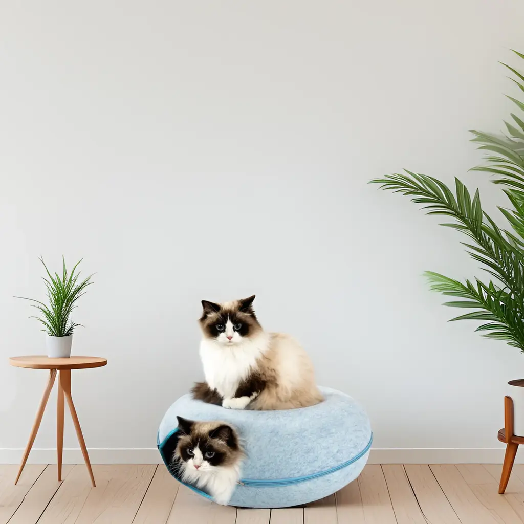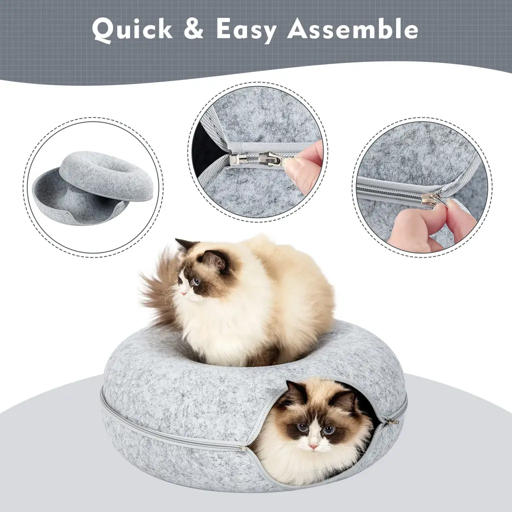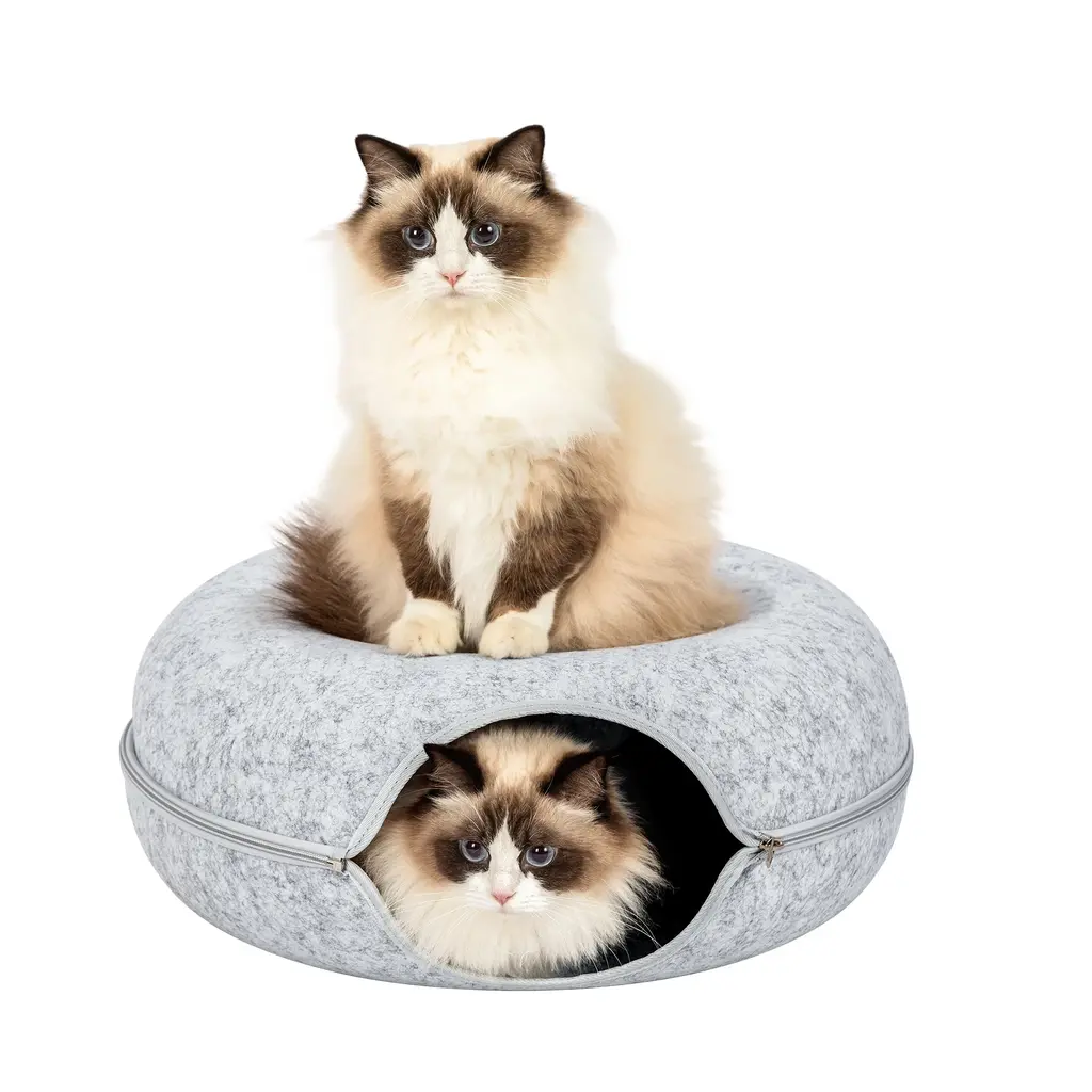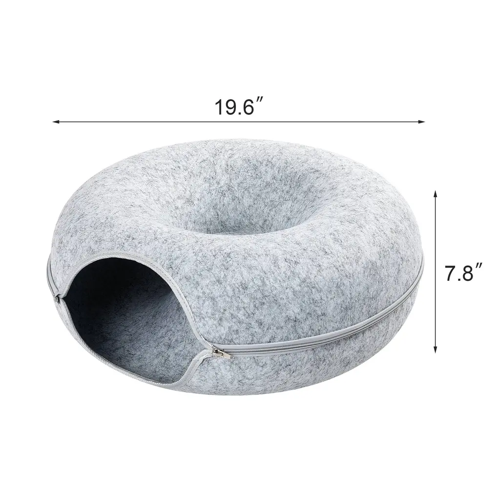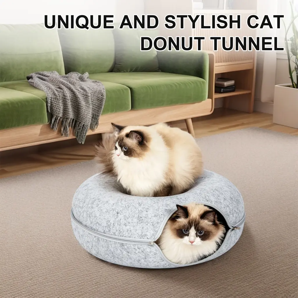 Give your cat the perfect blend of play and relaxation with this thoughtfully designed cat tunnel bed. Featuring a spacious interior, a sturdy lounging top, and a circular middle opening for interactive fun, this bed caters to your cat’s playful and restful moments. Made from eco-friendly felt fabric with durable zippers, it offers a cozy and long-lasting solution for your pet. The detachable and easy-to-clean design ensures low-maintenance care, while its sleek and modern aesthetic complements any home décor. Perfect for pet owners looking for both functionality and style. Feature: