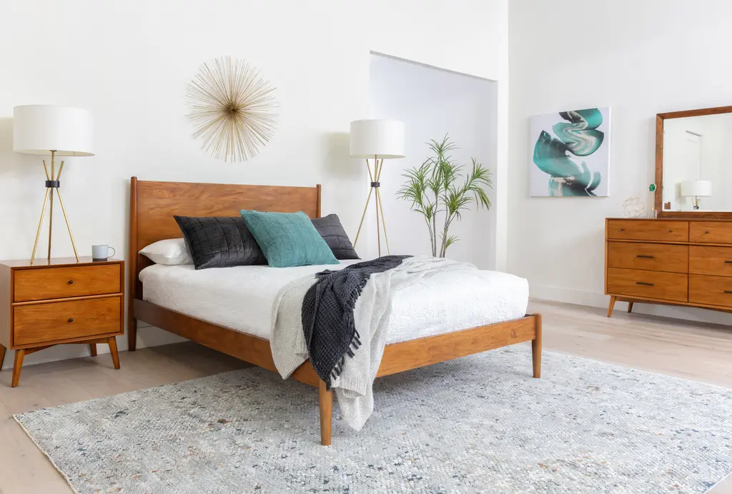 Transform your bedroom into a stylish retreat with the Alton Cherry II California King Wood Platform 3 Piece Bedroom Set. This set, featuring a bed and two night tables, is designed in a mid-century modern style that adds a touch of sophistication to any space. The cherry wood finish and tapered legs create a timeless look, while the solid rubberwood construction ensures lasting durability. Plus, the set is adjustable base compatible, offering you the flexibility to customize your sleeping experience.