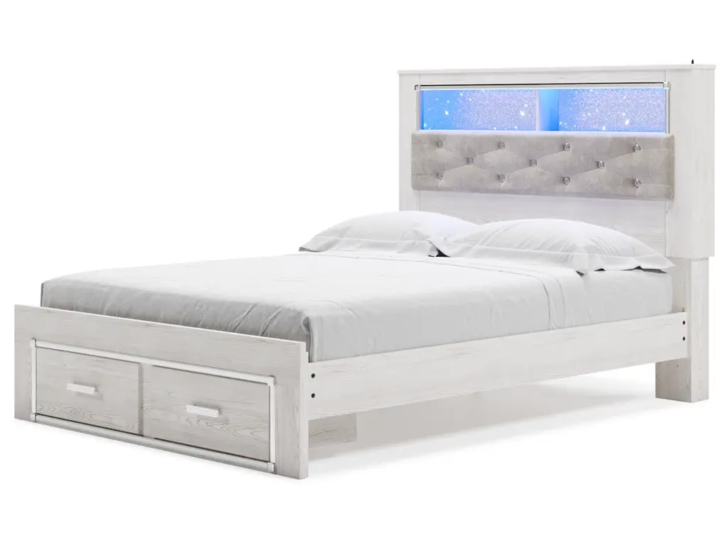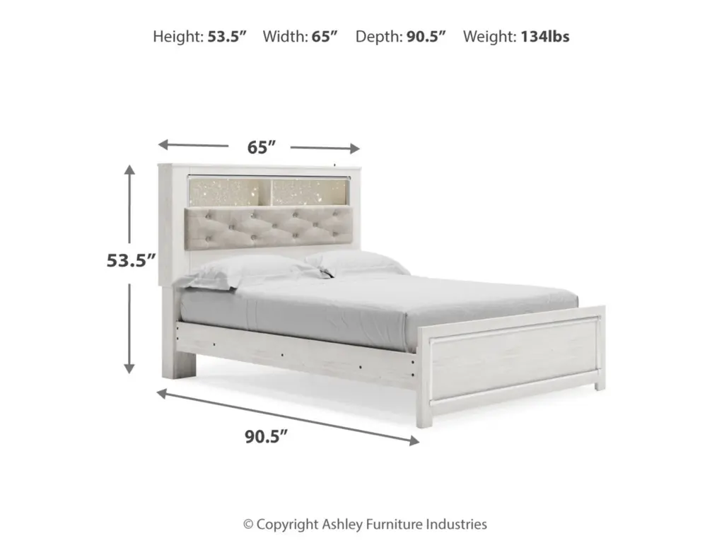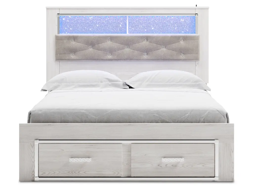 The epitome of fashion-forward design, the Altyra queen upholstered bookcase bed is a beautiful blend of comfort and luxury. Shiny chrome-tone accents, a pearlized finish and button-tufted upholstery bring a glam touch to the richly rustic appearance. Remote-controlled LED lighting adds style and modern convenience to your restful retreat.