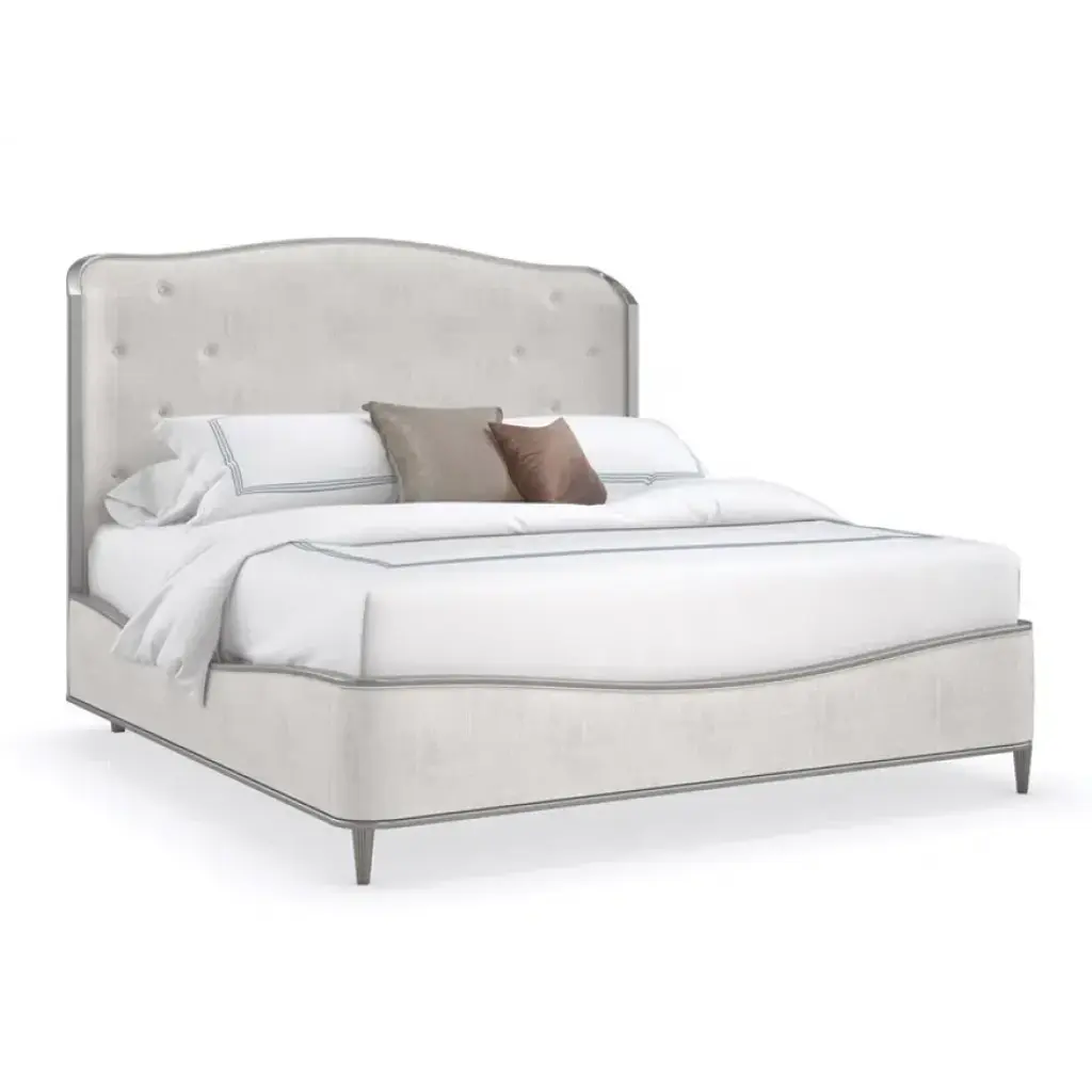 An Art Deco style upholstered king bed with tortoise inlay details. This bed is full of well-appointed luxurious details and design. It has a graceful profile with a gently curved headboard accented with acrylic tortoise shell-inspired inlay. Soft silver paint highlights its exquisite wood trim and draws the eye to its contemporary plinth base.Dimensions81" W x 85.5" D x 60" H.