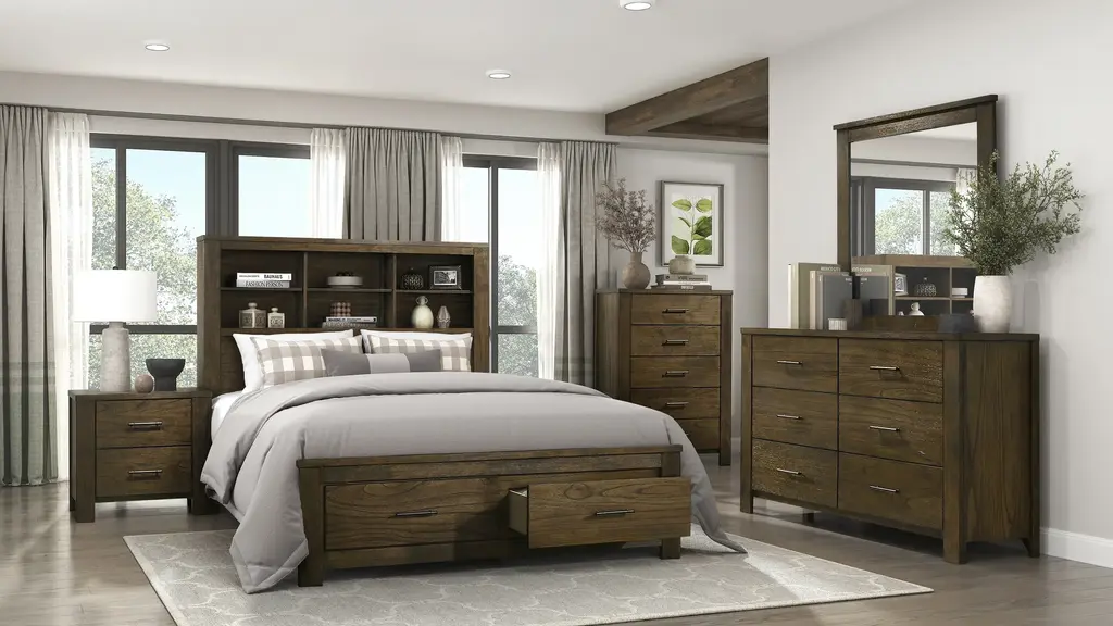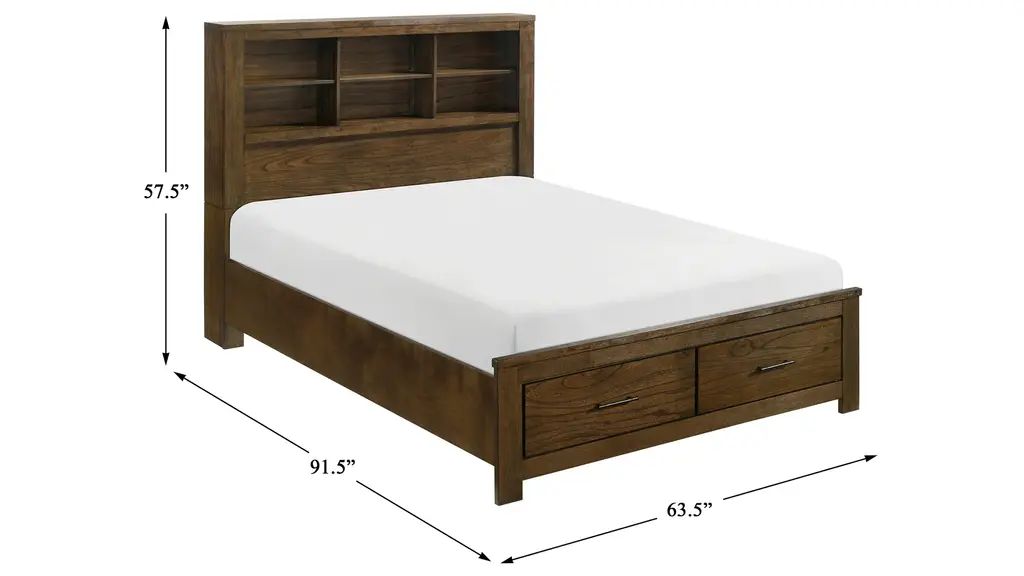 The Arya Platform Bed with Storage provides ample drawers and shelves to achieve your desired bedroom design. The bed's headboard features bookcase shelving, allowing for open display, and the drawers of the footboard allow for under-bed storage. The wire-brushed oak finish over mindy veneer lends subtle rustic aesthetic to the collection while dark brown metal bar hardware provides complementing accent to the drawer fronts of the storage footboard drawers.