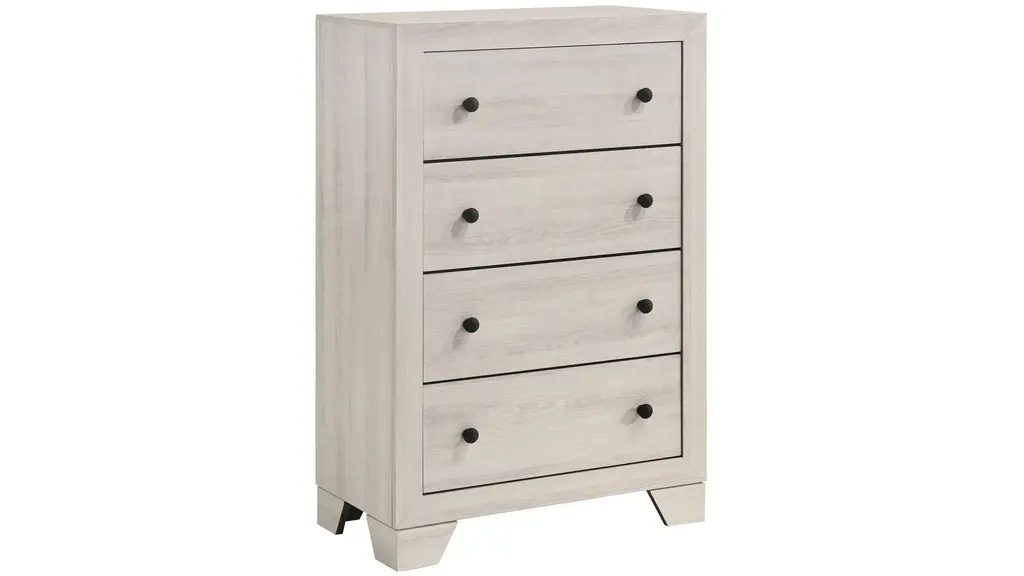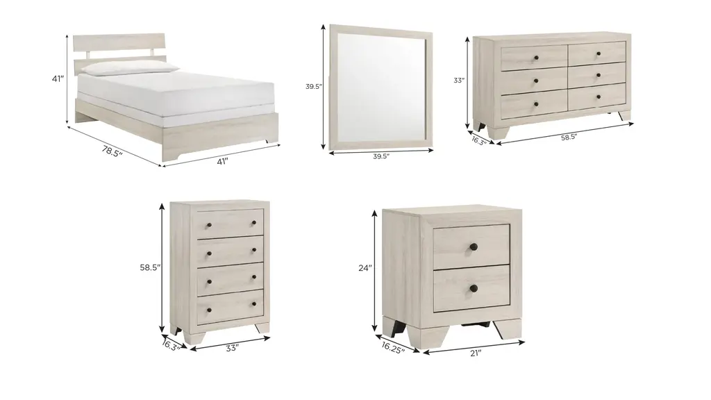 The Atticus 5-pc. Bedroom Set embodies a rustic, yet contemporary aesthetic with its clean lines and neutral color palette. The set includes a low-profile bed frame, a dresser with a mirror, a nightstand and a tall chest, all finished in a versatile white wash that easily complements any decor. The sleek metal handles on the drawers add a touch of contemporary flair, while the large mirror reflects light, making the space feel brighter and more open.