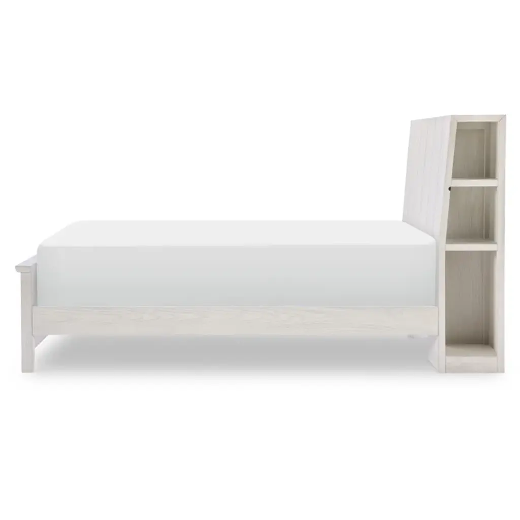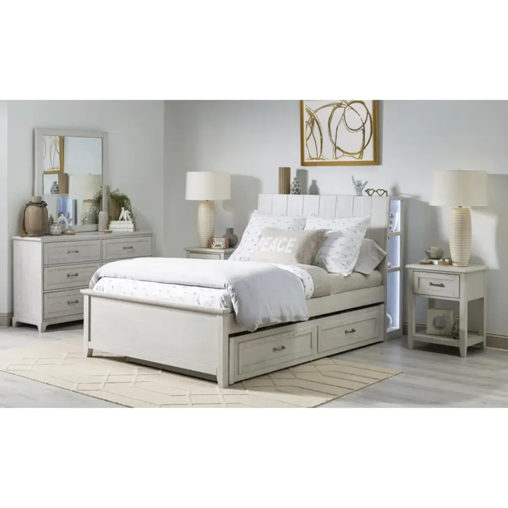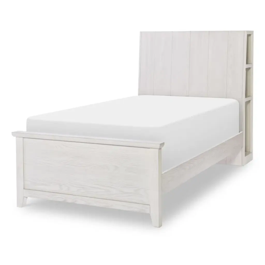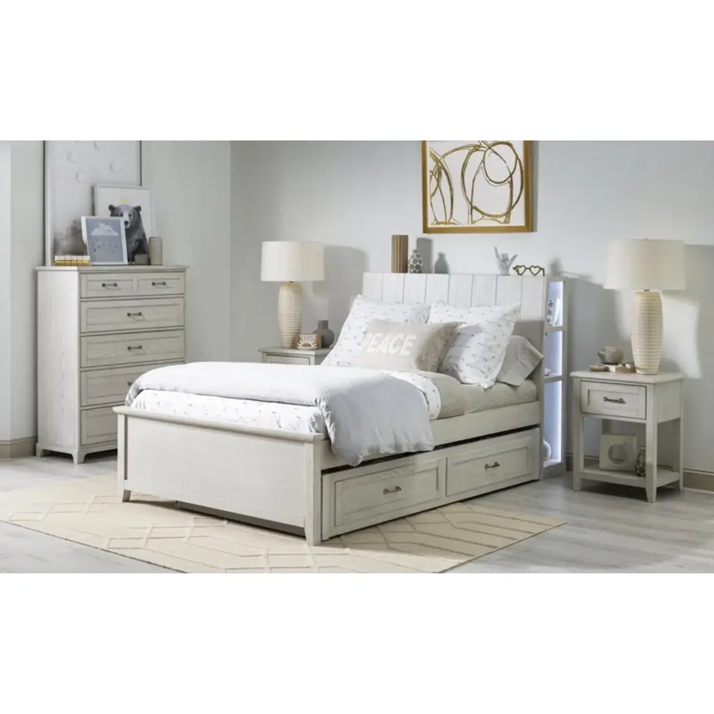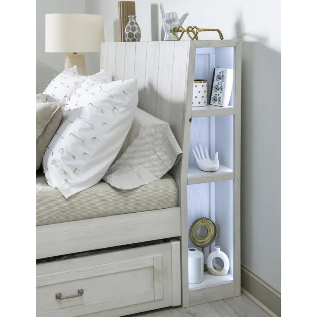 The August Youth Bedroom collection is a unique blend of style elements that give a modern bohemian vibe. Details such as thick framed drawer fronts, shaped feet and plank details on beds all blend well. Features can be found through the group, such as touch lighting on beds and a cool bookcase headboard with shelf storage on the sides of the headboard. The Bleached Linen finish on White Oak veneers offers a subtly beautifully tone. Brushed Nickel hardware completes each piece.