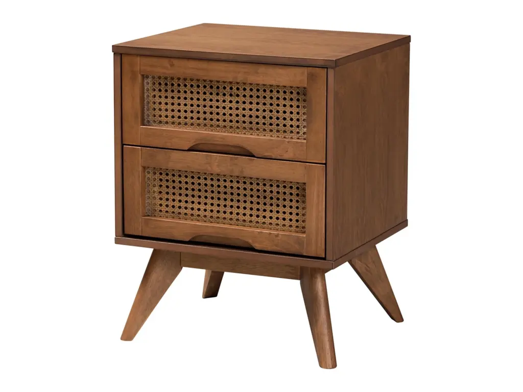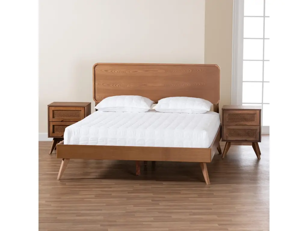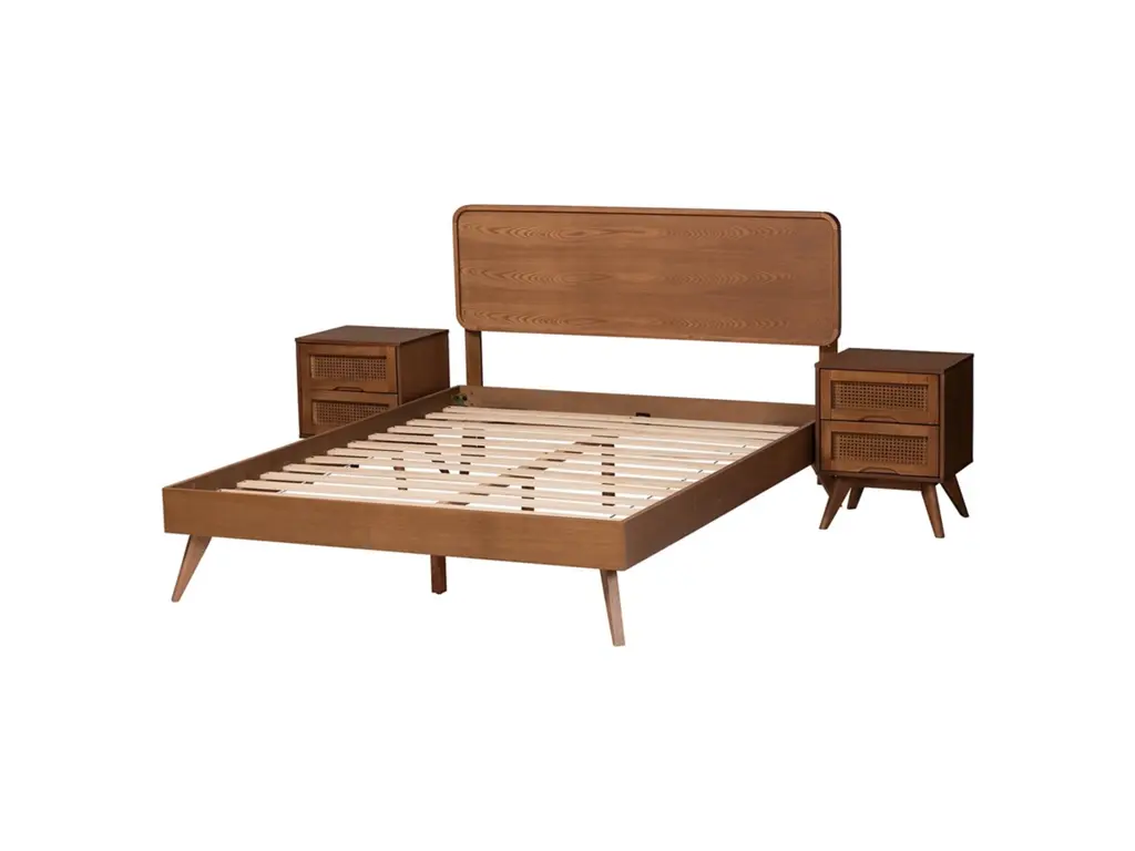 Refresh both the capability and charisma of your bedroom with the fantastic Demeter bedroom set. Made in Malaysia, this mid-century set includes one bed and two nightstands crafted from sturdy wood. Each nightstand is fitted with two drawers to accommodate your needs while reserving the tabletops for nightly use. The Demeter requires assembly and utilizes wood slats for mattress support, eliminating the need for a box spring. Brilliantly woven rattan embellishments lend classic exuberance, making the Demeter bedroom set an incredible arrangement.