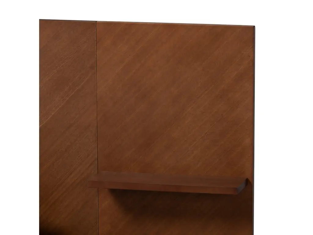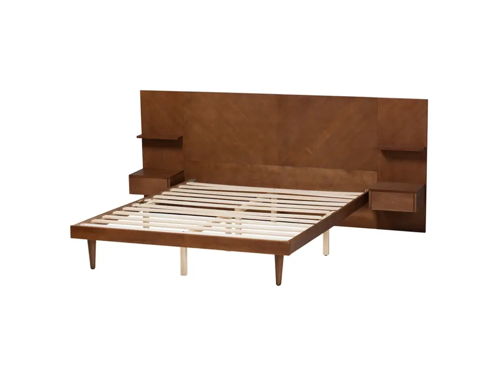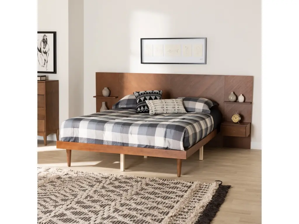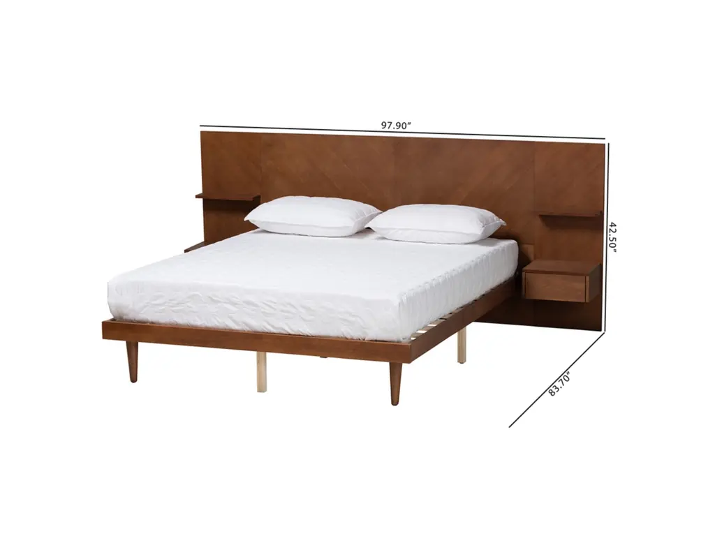 Endow your bedroom with a visually impressive yet accommodating centerpiece with the stunning Graham platform bed. Made in Malaysia, this remarkable piece is crafted from sturdy wood. Its elongated headboard is outfitted with two shelves and two built-in nightstands that effortlessly organize bedside essentials. The Graham requires assembly and utilizes wood slats for mattress support, eliminating the need for a box spring. Tapered legs accentuate the mid-century inspiration of the piece, making the Graham platform bed a superb addition to any bedroom.