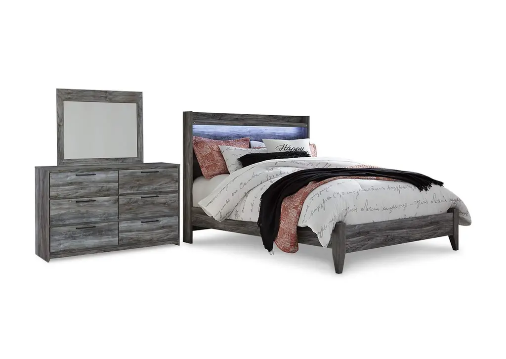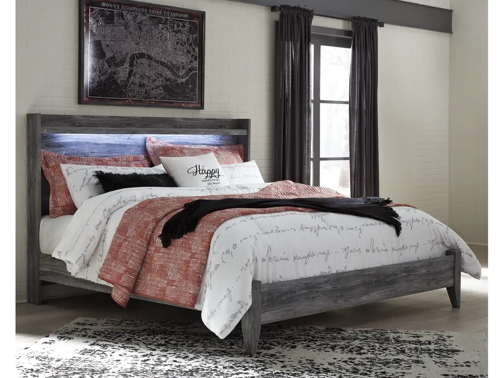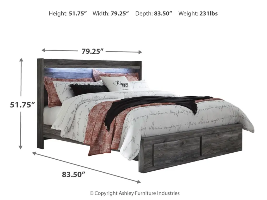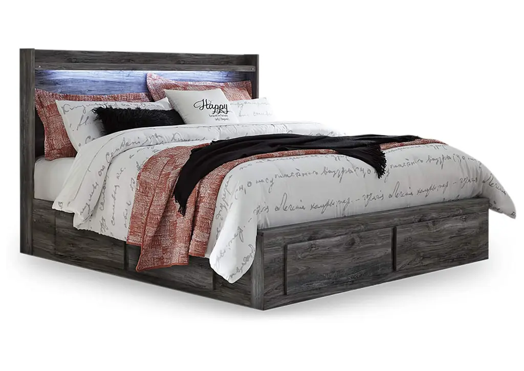 Rest in the casually cool style and practicality of the Baystorm king panel storage bed. Its driftwood and smoky finish gives this bed an easy-going vibe that's perfect for creating a relaxed getaway in the room. Two underbed storage drawers provide ample room for stowing away spare bedding and more. Clean lines and modern charm blend for a fuss-free look. Included slats eliminate need for foundation/box spring. Mattress sold separately.
