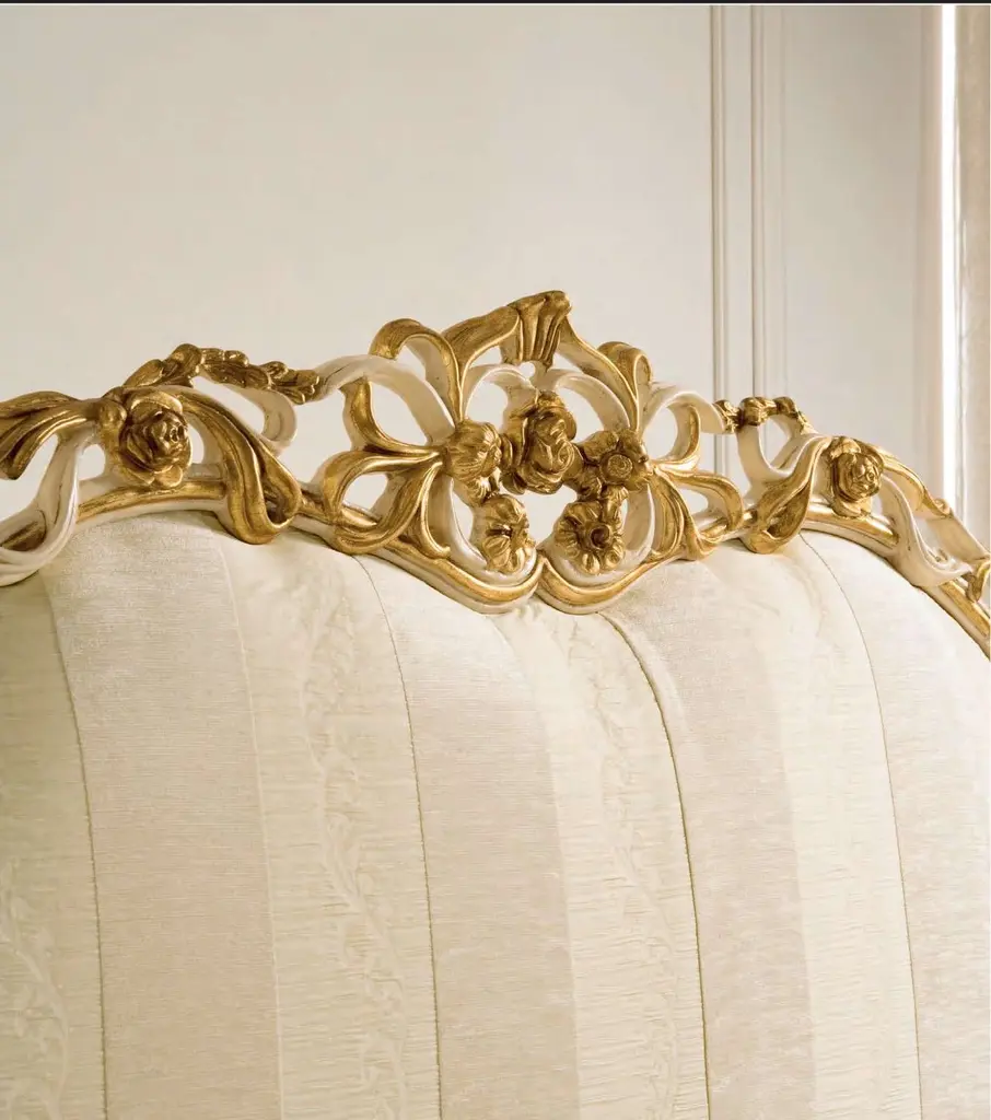 Classic Italiano Bedroom – Set.This bedroom set from Florence Art follows the Florentine tradition, greatly influenced by Florence & the surrounding area’s love of beauty in art & passion for classicism. The ‘Florentine Style’ is characterized by the way carvings, trimmings and the design of the pieces are made. Each piece created in the Florentine tradition is elegantly carved & lightly rendered. The result is remnant of a classical but very youthful style. Florentine carving is distinguished by its grace and harmony, and by its defining mark of being characteristically Florentine, which cannot be mistaken for the styles of any other geographical region.Art.7528 Letto / Bed Testata / Headboard cm. 185xH.151 Pediera Art.5901 cm. 179xh.38 Rete Esclusa / Bed Spring not included Art.8000 cm.170×190 (eventuale predisposizione per reti da appoggio da richiedere) Cod.Finitura / Cod.Finish 820/C – Cat.2 – Imbottitura Liscia / Upholstered “Plain” Tessuto / Fabric – Art.Deco’ Riga Letto in legno decorato a mano a colori policromi anticati e “Foglia Oro” Wooden Bed handmade decorated antique policrom colours and “Gold leaf ”Shop All Florence Art Catalogs Furniture by Catalog