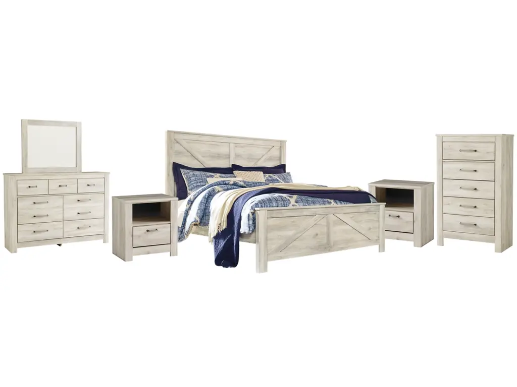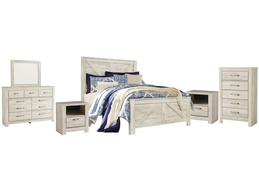Express your farmhouse style with the Bellaby bedroom set. Wispy white finish over replicated oak wood grain is a delightful change from the ordinary. Clean-lined, classic styling provides a country chic aesthetic that’s a breath of fresh air.