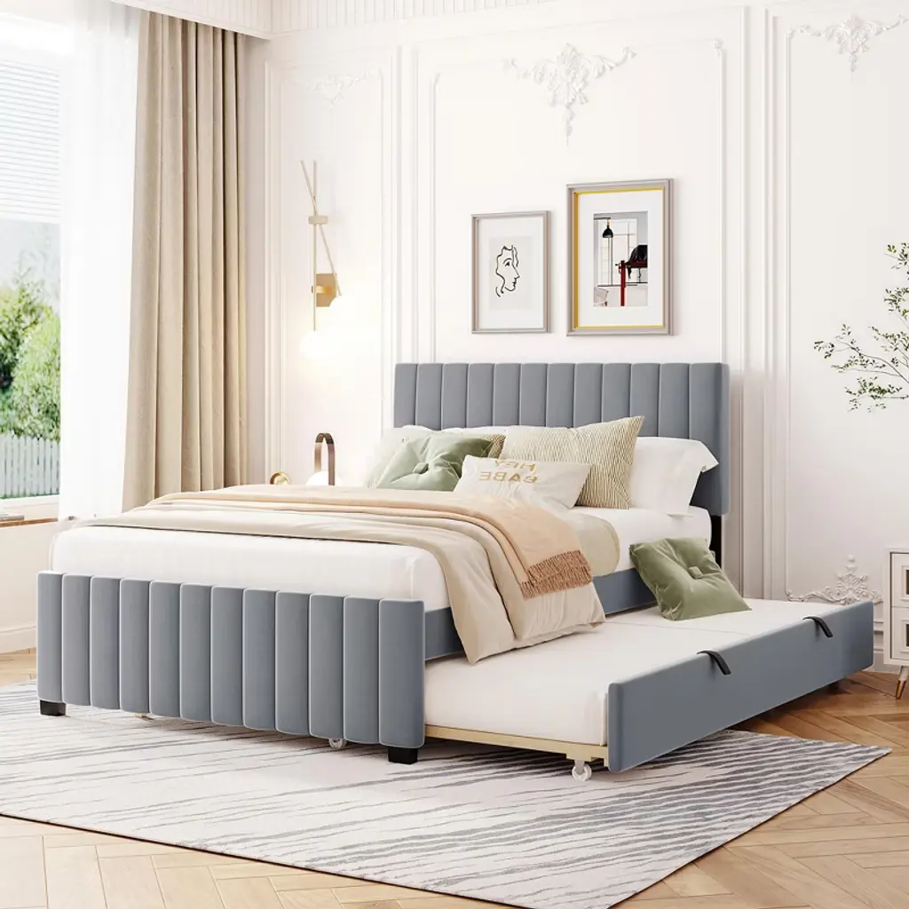 Upholstered in carefully-selected velvet fabric, in elegant color, this full upholstered bed frame with trundle not only suits any home décor,but is timeless in its design.This product will be delivered in two different boxes. It's possible that the two boxes won't arrive simultaneously. Please wait patiently