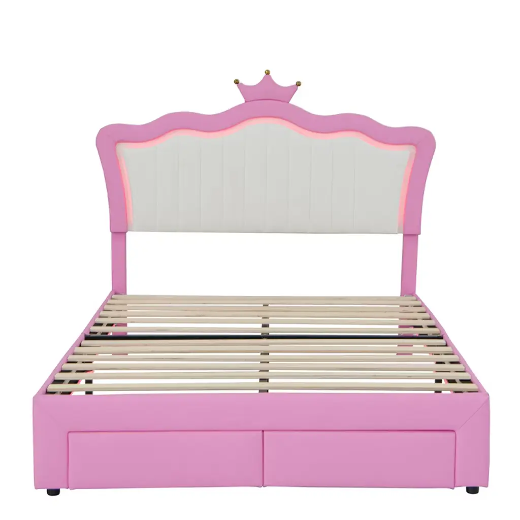 Bellemave Full Size Upholstered Platform Bed With Storage Drawers, Princess Bed Frame For Girls With Rabbit Headboard & Led, Pink