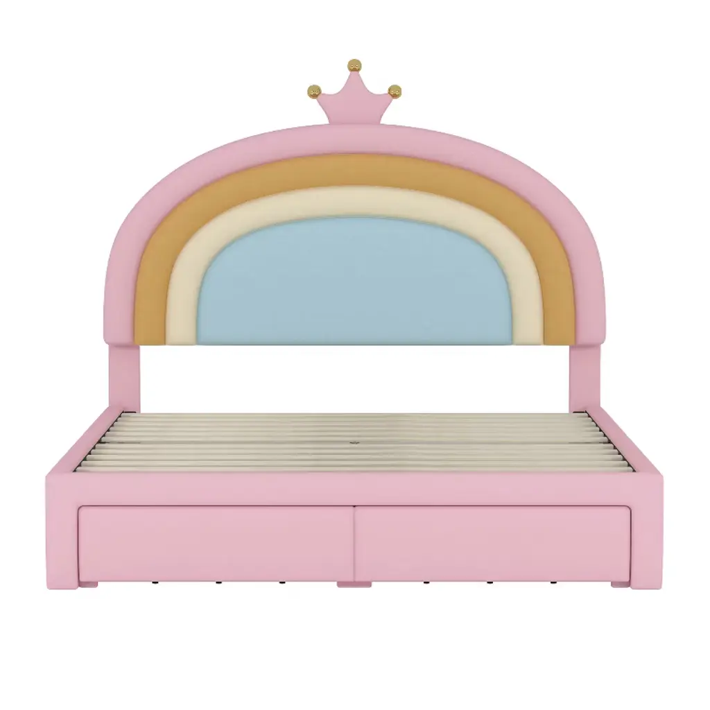Bring color and functionality to your bedroom with the rainbow design bed. Featuring a vibrant rainbow design and soft velvet upholstery, it adds style and comfort to any space. The platform frame requires no box spring, while a built-in storage drawer keeps essentials neatly organized. Perfect for a bold and practical bedroom upgrade.