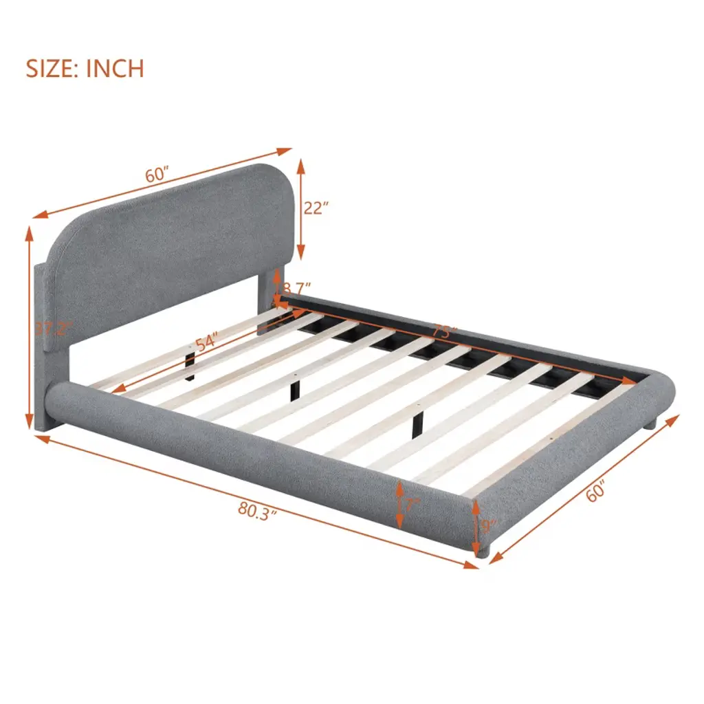 This beautiful Upholstered Platform Bed with with curve-shaped design on the headboard, footboard and side rails, adds a contemporary chic look to your bedroom and is upholstered in thick teddy fleece fabric to add extra comfort. Sturdy wood frame construction and a wooden slat system to add extra stability and safety.Enjoy many long years of relaxation and family fun, secure in this meticulously designed platform bed.This grounded upholstered bed will be both a beautiful piece in the room and a place full of fun for your family.